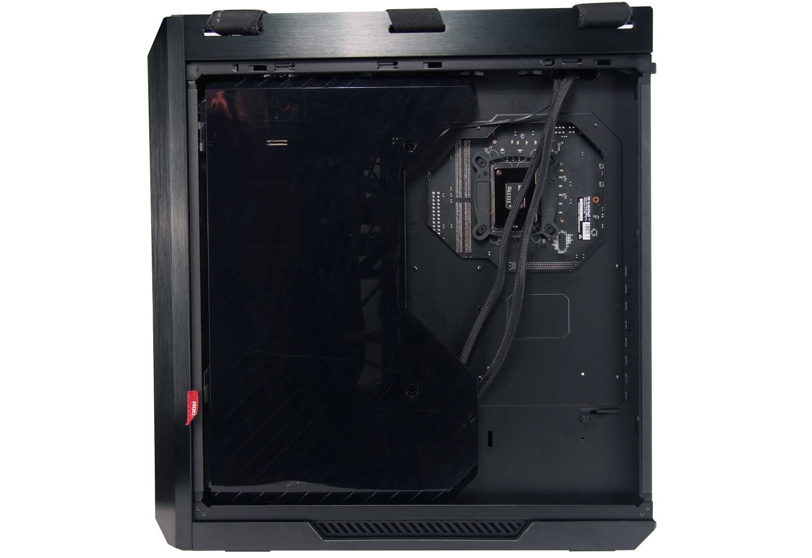 Левая и правая стенки корпуса выполнены из закалённого стекла толщиной 4 мм. Каждое стекло установлено в алюминиевой раме. Для того, чтобы снять эти панели не придётся искать отвёртку: они удерживаются при помощи механических замков, которые открываются по нажатию кнопок на задней стенке корпуса. При этом, во время открытия любой панели, стекло не упадёт на стол. Оно откинется под небольшим углом. После чего панель можно вынуть без труда.
