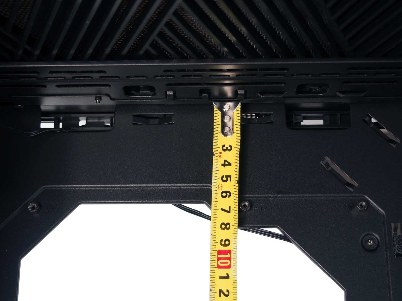 Ещё одна из важных особенностей Гелиоса, это съёмные панели для установки верхних и фронтальных вентиляторов. Владельцу такого корпуса не придётся страдать, пытаясь установить вентилятор или крупный радиатор СВО на верхнюю панель корпуса. Достаточно снять рамку, прикрутить к ней радиатор или вентиляторы, а затем вернуть рамку на место. Просто и удобно. Что касается возможностей установки «вертушек», радиаторов СВО, процессорных кулеров и видеокарт то доступны следующий варианты: