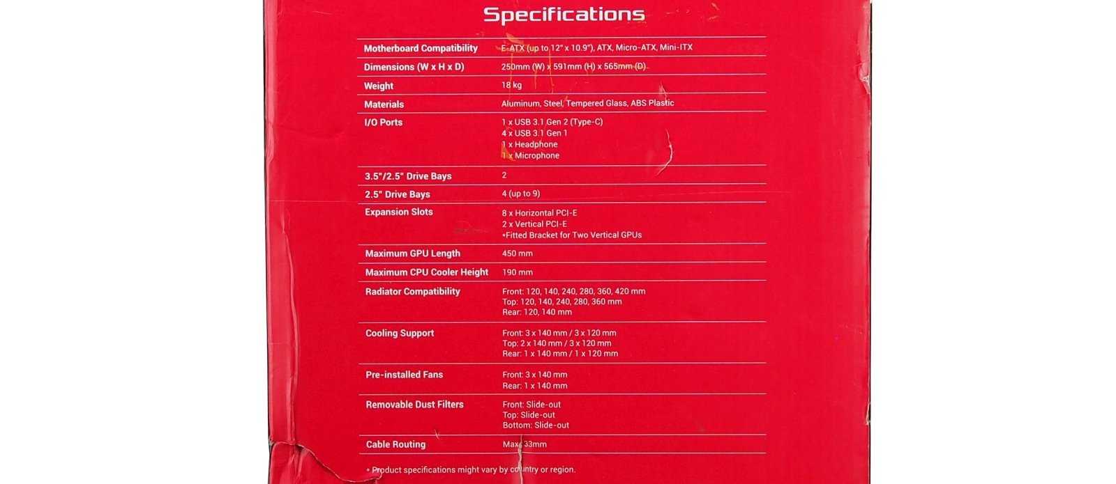 Производитель указывает спецификацию корпуса ROG Strix Helios на торцевой грани упаковки. Здесь подробно указана информация о возможностях установки радиаторов охлаждения и вентиляторов, допустимых габаритах графического адаптера, а также количестве поддерживаемых накопителей.