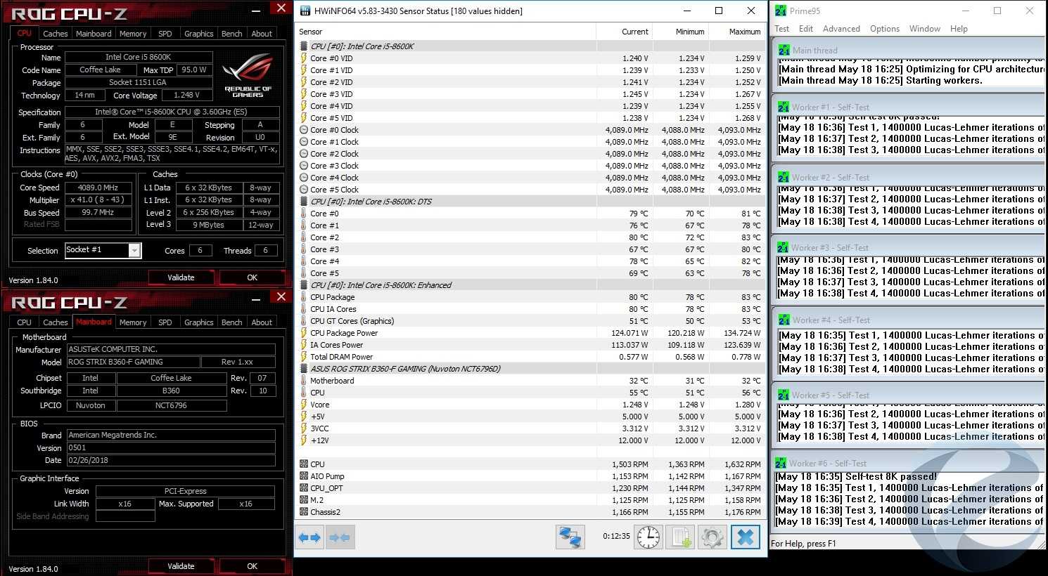 Также стресс-тест Prime95 позволил проверить и температурный режим компонентов. В случае с ROG Strix B360-F Gaming присутствовала возможность мониторинга температуры чипсета, которая в пике составила 56 градусов Цельсия. Процессор Intel Core i5-8600k разогрелся до 83 градусов Цельсия, если оценивать по самому горячему ядру.