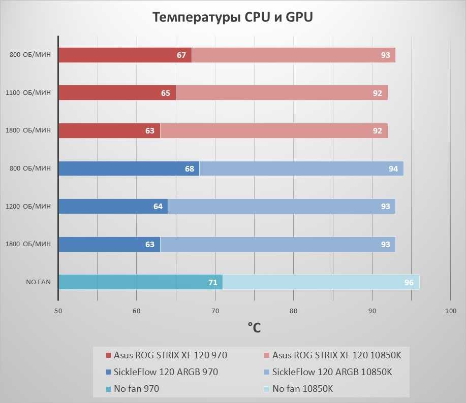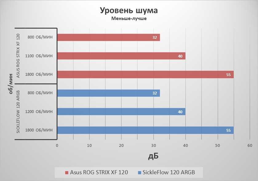 По результатам тестов комплект ASUS ROG STRIX XF 120 показал себя несколько эффективнее оппонента, как в бесшумном режиме, так и при максимальных оборотах. Стоит отметить, что повышение оборотов с 1100 до 1800 не дает ощутимых результатов по температурам, но делает нахождение рядом с системным блоком некомфортным из-за повышенного уровня шума.
