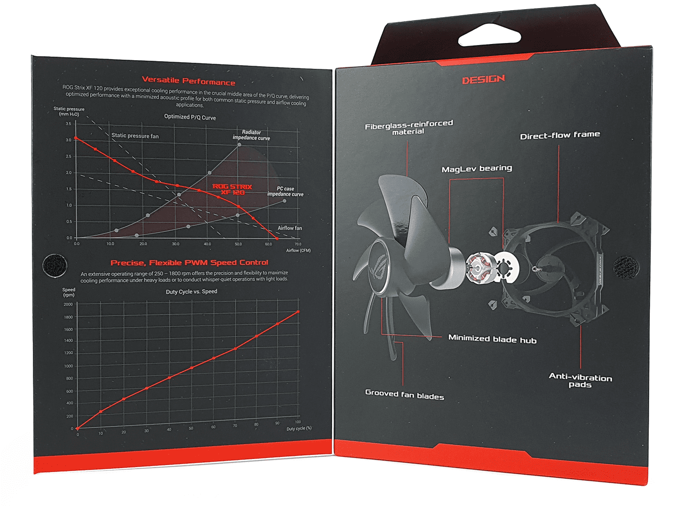 Передняя часть открывается подобно книжке. Первоначально ожидаешь увидеть прозрачное окошко, за которым будет находиться сам вентилятор. Но не тут то было. Asus решили использовать эту часть упаковки для демонстрации дополнительной информации. На левой части изображена кривая зависимости статического давления от воздушного потока, а также зависимость скорости вентилятора от коэффициента заполнения ШИМ. На правой части изображена конструкция вентилятора с указанием отличительных особенностей.