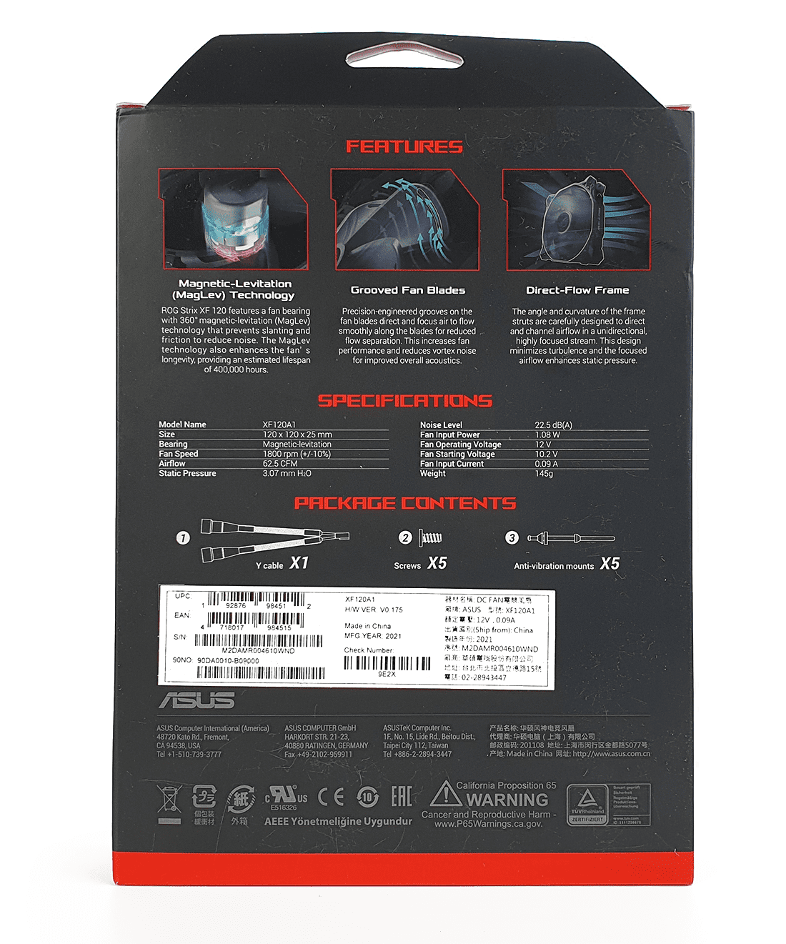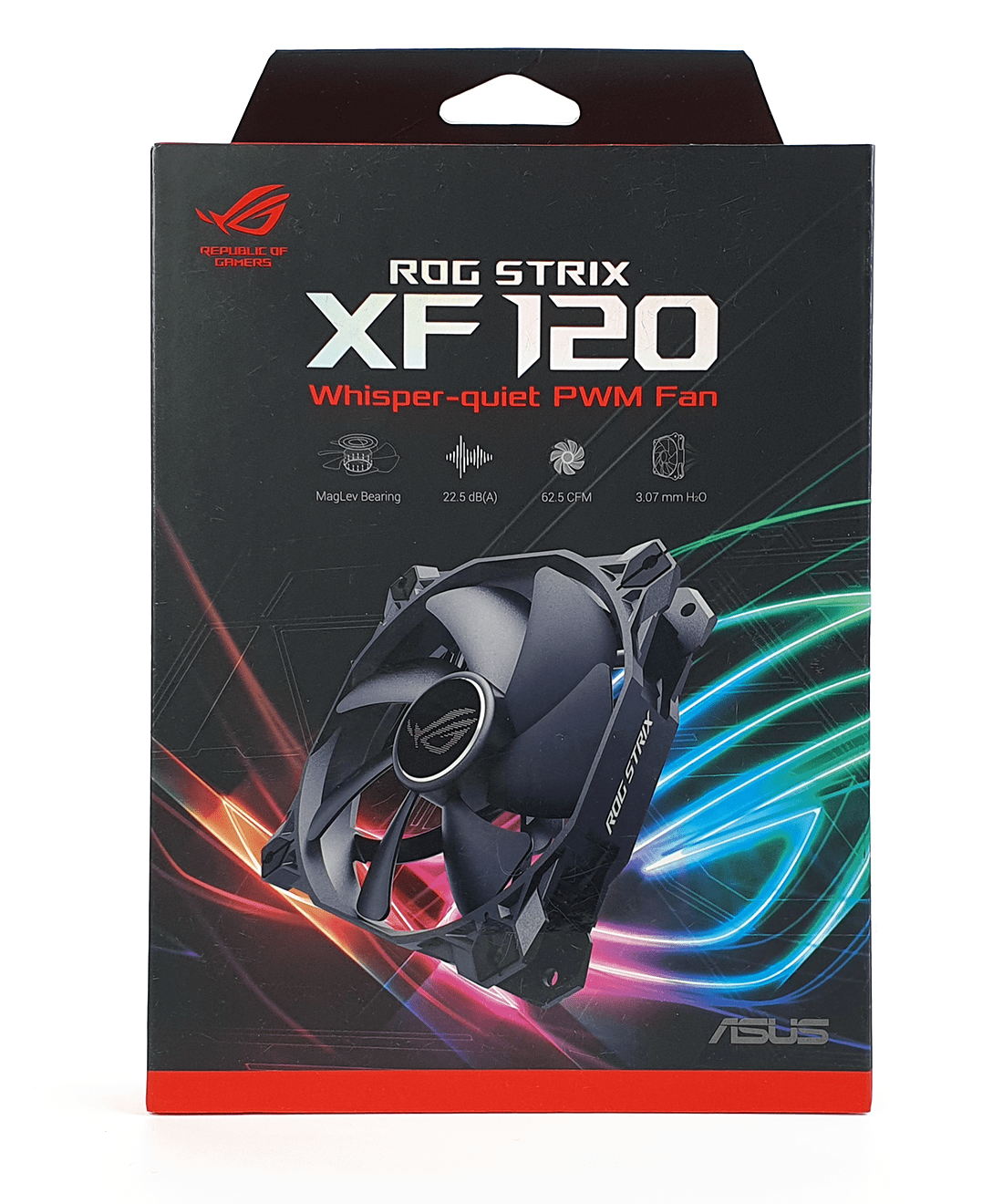 Следуя поговорке, Asus ROG STRIX XF 120 встречает нас качественной и красочной картонной упаковкой с цветной полиграфией. Лицевую сторону украшает крупное название, переливающееся разными цветами, и изображение вентилятора. Помимо этого производитель указал отличительные характеристики.