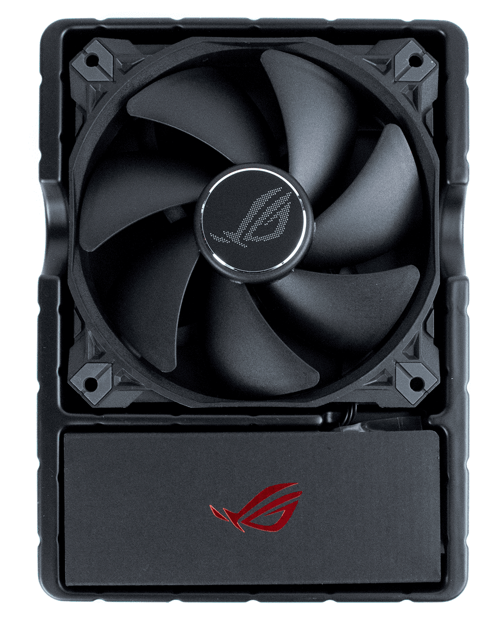 Внутри коробки находится пластиковый контейнер с вентилятором и дополнительными аксессуарами. Последние расположены под картонной заглушкой с логотипом ROG.