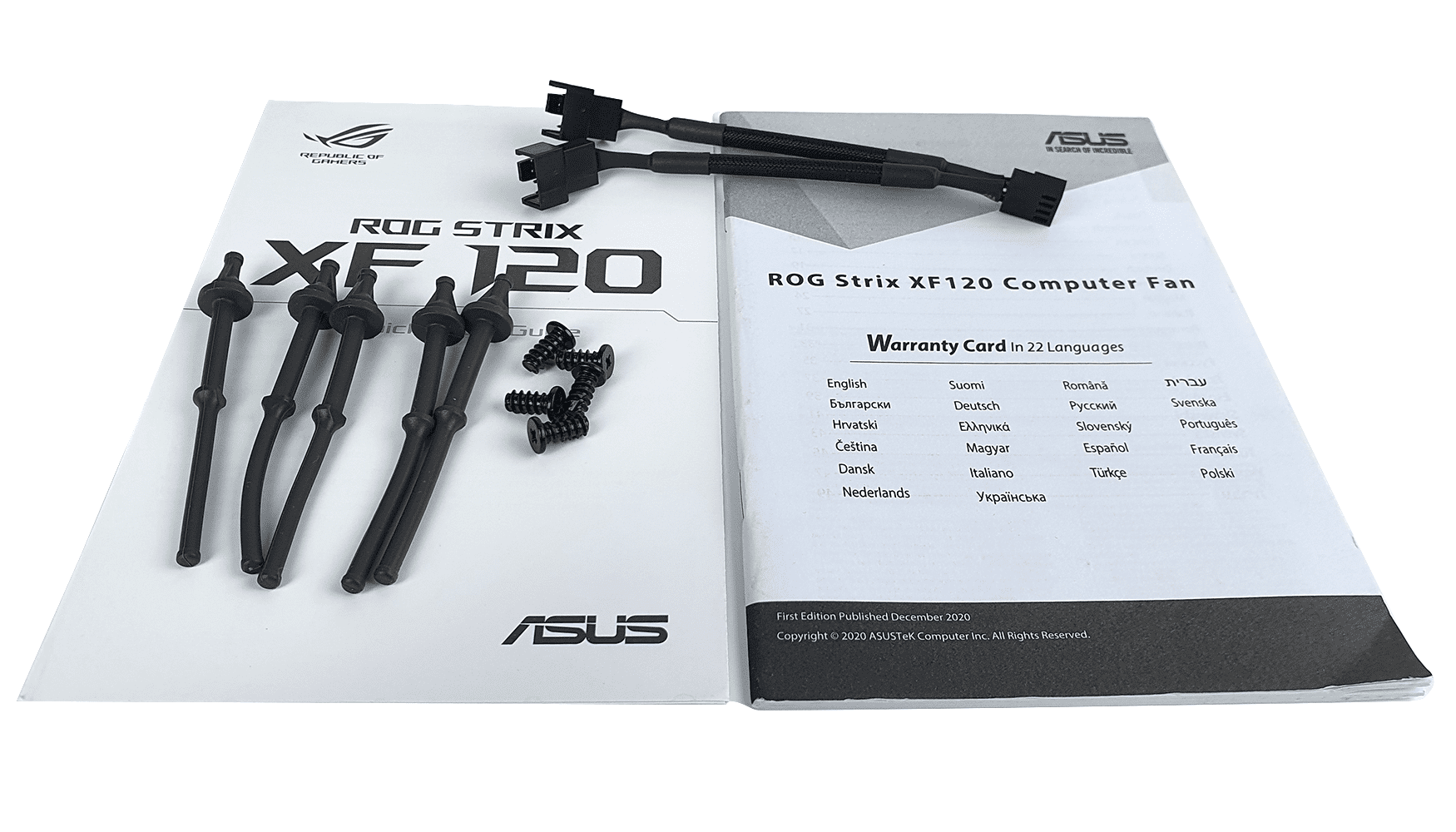 В отдельном коробе есть все необходимое. Производитель укомплектовал вентилятор двумя типами креплений: быстросъемными силиконовыми и металлическими винтами. Примечательно, что и тех, и других в комплекте по 5 штук. Помимо этого в наличии Y-образный разветвитель на два вентилятора и руководство по эксплуатации с гарантийной информацией.