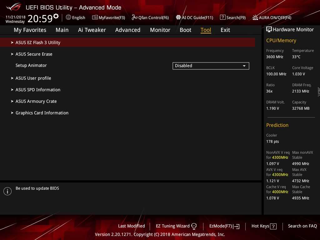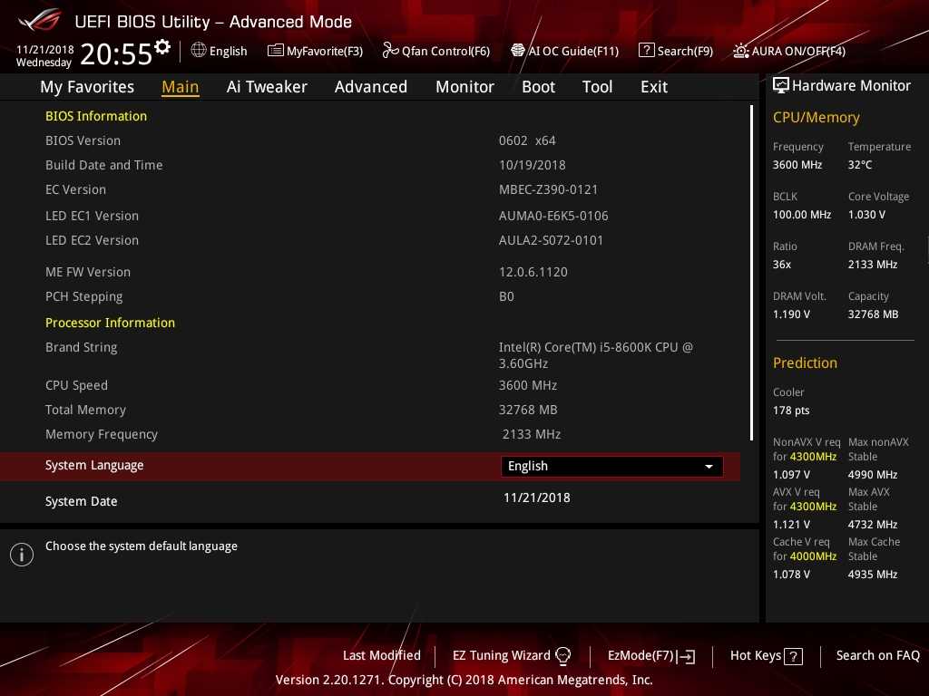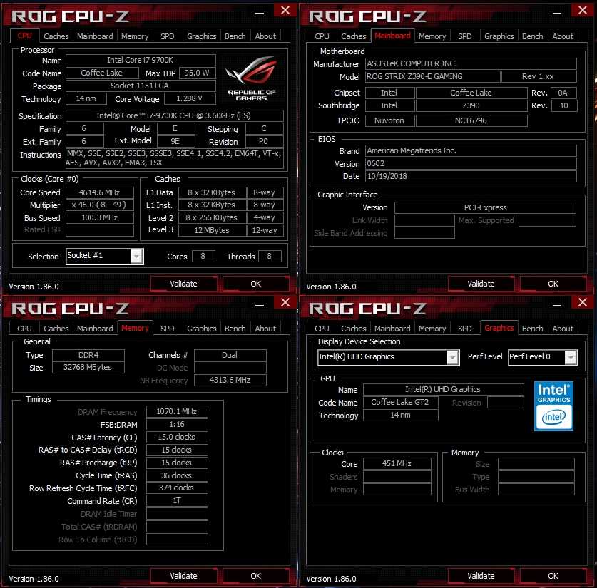 Для теста материнской платы ROG Strix Z390-E Gaming, а также оценки ее оверклокерских возможностей мы выбрали соответствующий процессор. Новый 8-ядерный Intel Core i7-9700k занял место в сокете материнской платы, прошивка BIOS которой была обновлена до последней версии 0602 от 19/10/2018.