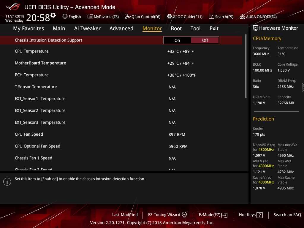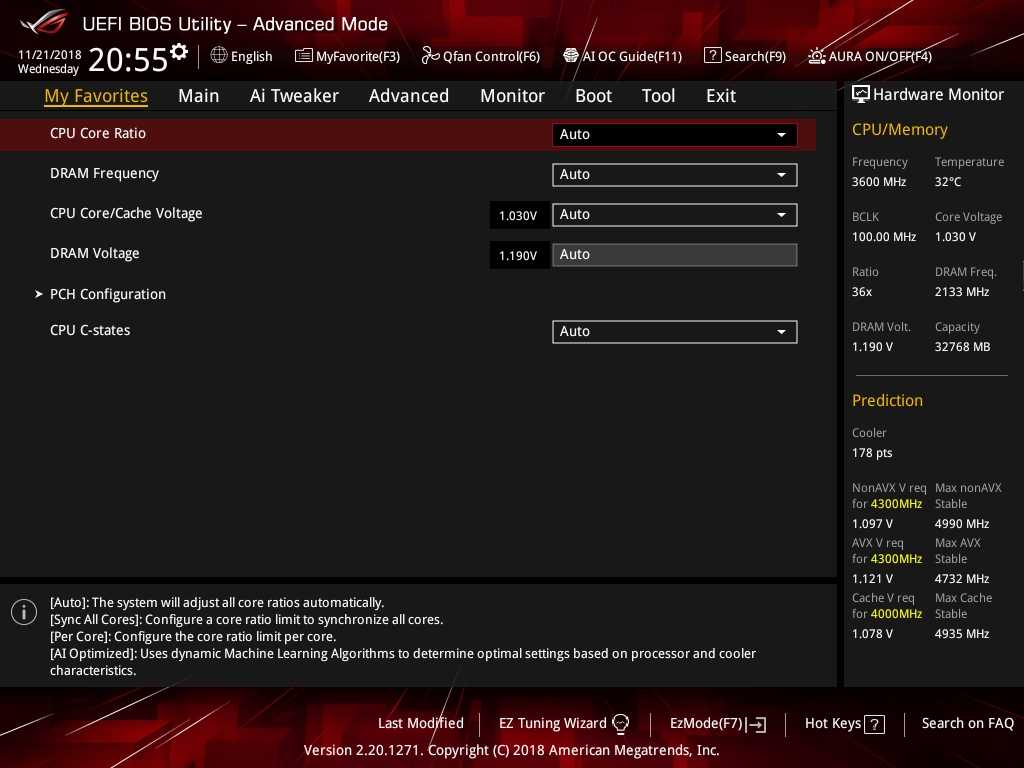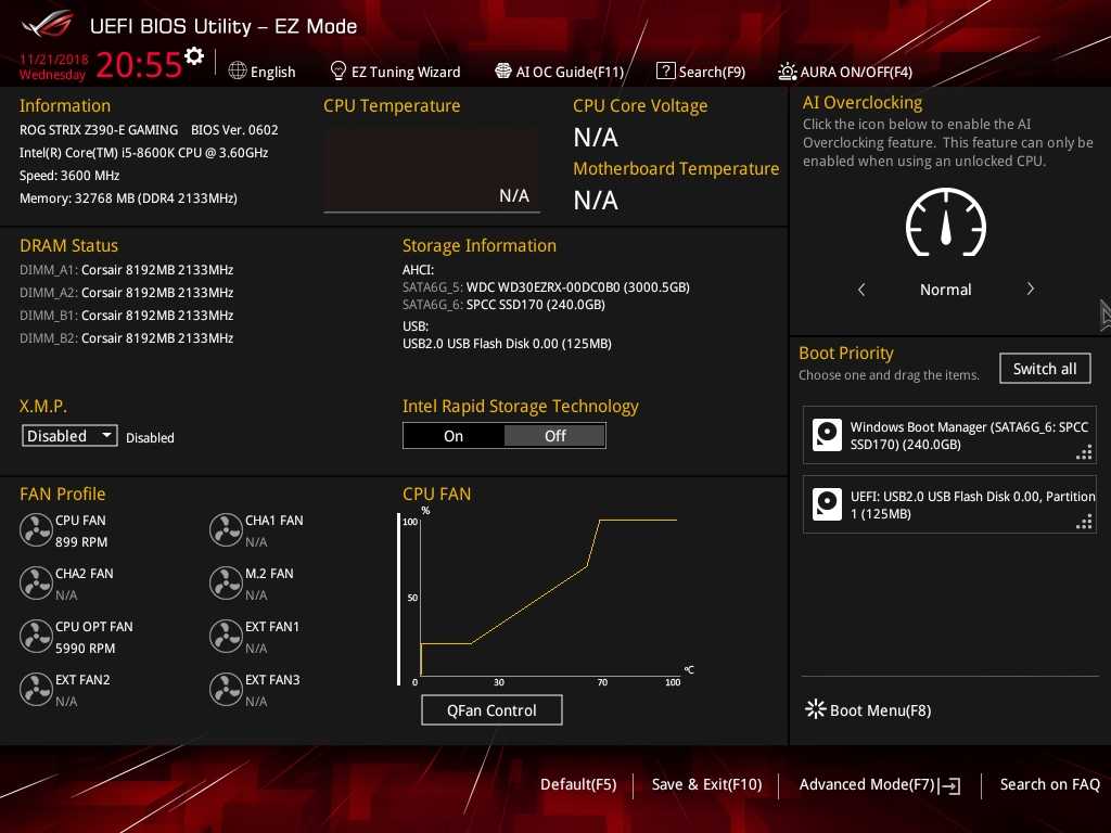 Настройки BIOS платы ROG Strix Z390-E Gaming оформлены в соответствии с корпоративным стилем серии Republic of Gamers в красно-черных цветах. Оболочка UEFI BIOS представлена двумя интерфейсами: EZ Mode — для информации о системе, а также Advanced Mode в виде полного перечня настроек.