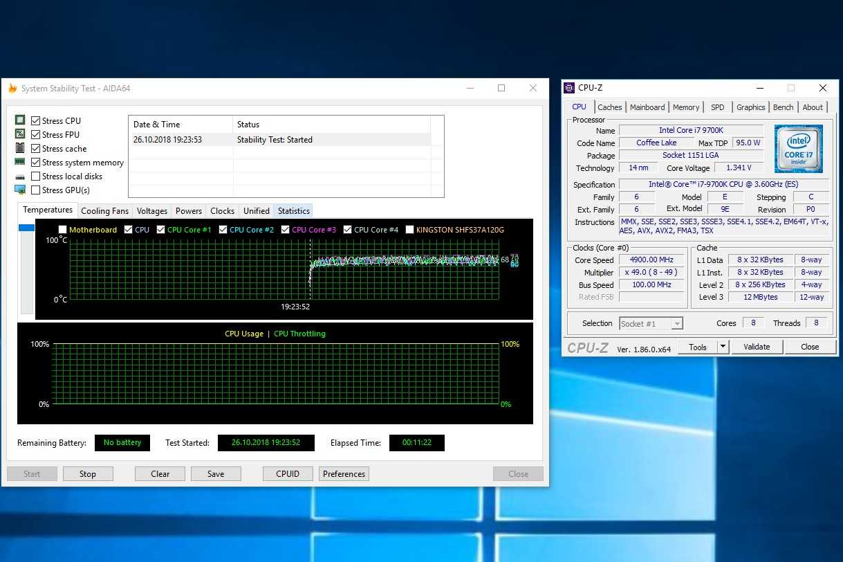 В комплекте с Arctic Freezer 33 eSports ONE для процессора Core i7-9700K было предложено ускорение чипа до 4900 МГц с повышением напряжения под нагрузкой до 1,34 В. Конечно, итоговый результат требует всесторонней проверки стабильности