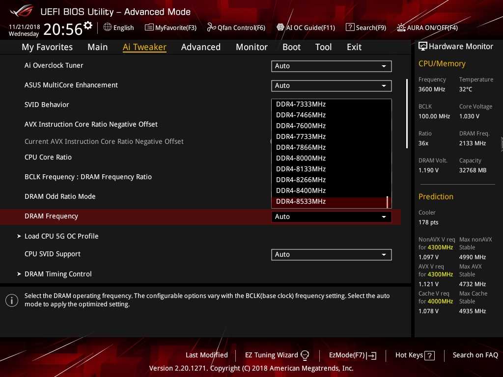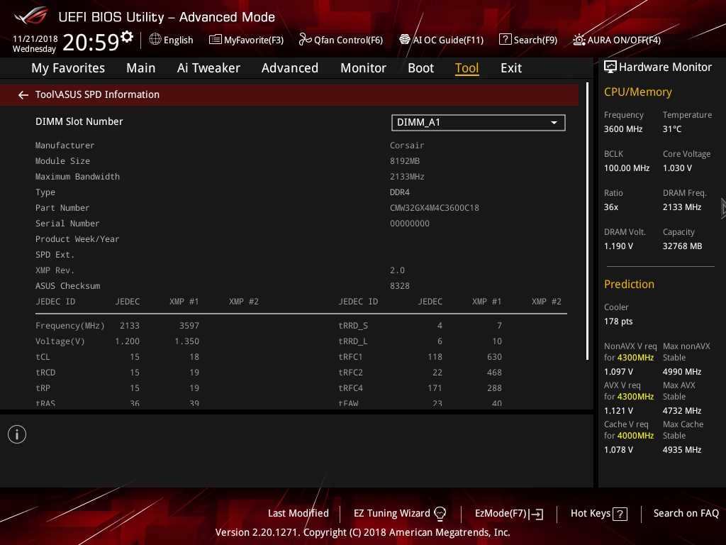 Оперативная память Corsair Vengeance RGB Pro на материнской плате ROG Strix Z390-E Gaming без проблем заработала на частоте 3600 МГц с таймингами 18-19-19-39-2Т при напряжении 1.35 В.