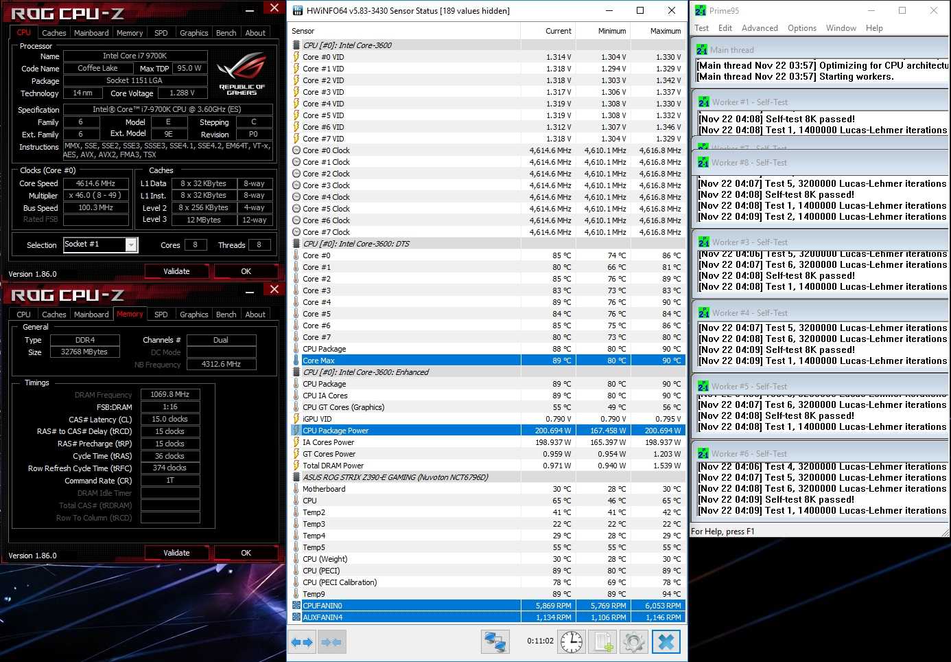 Для того, чтобы понять, насколько корректно материнская плата ROG Strix Z390-E Gaming может работать с новыми 8-ядерными процессорами Intel, были проведены тесты при различных настройках системы питания процессора. Первым экспериментом мы рассмотрели работу ROG Strix Z390-E Gaming с настройками BIOS умолчанию. При нагрузке всех 8-ми ядер процессора программой Prime95 было выявлено, на сколько сильно плата завышает напряжение. Среднее напряжение на каждом из ядер составило 1.318 В под нагрузкой, что неминуемо привело к потреблению питания процессора до 200 Вт. Под системой жидкостного охлаждения Enermax LiqFusion 240 наш i7-9700k нагревался до 90 градусов Цельсия.