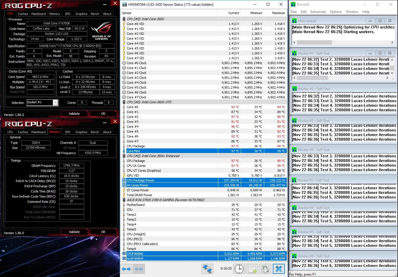 Третьим этапом наших экспериментов с ROG Strix Z390-E Gaming стал разгон процессора Intel Core i7-9700k. Несмотря на используемую нами систему охлаждения Enermax LiqFusion 240 с ее компактным радиатором, мы смогли добиться результата в 4.9 ГГц по всем восьми ядрам i7-9700k. Рабочее напряжение при этом понадобилось повысить до 1.400 В, но фактически под нагрузкой оно составляло 1.413 В. В этих условиях процессор потреблял до 240 Вт в нагрузке и нагревался до 99 градусов Цельсия. Результат под Prime95 с его AVX инструкциями более чем достойный. Чувствовалось, что наш экземпляр процессора способен взять и более высокие частоты, но камнем преткновения стала недостаточно эффективная система охлаждения CPU.