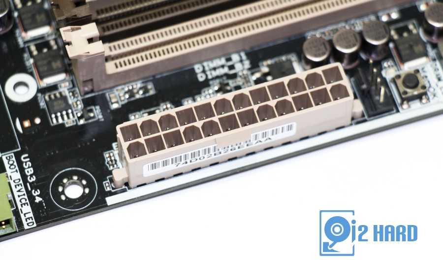 Питание материнской платы организовано по двум разъемам. Основной 24-пиновый разъем находится сбоку материнской платы, недалеко от слотов оперативной памяти.