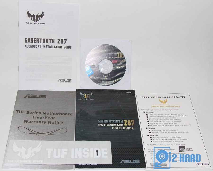 Комплектация у ASUS Z87 Sabertooth оказалась настолько обширной, что пришлось разделить ее на несколько составляющих. Первым на очереди идет бумажный и цифровой комплект, который включает в себя руководство пользователя, гарантийное руководство, сертификат успешности тестирования продукта, руководство по сборке, CD с драйверами, фирменную наклейку ASUS, а также наклейку «The Ultimate Force Inside».