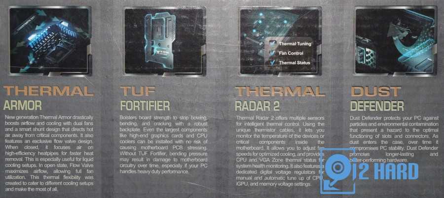 | Разное | Защита от пыли – TUF Dust Defender; TUF Thermal Armor – эксклюзивное решение для отвода тепла; TUF Thermal Radar – мониторинг температуры и автоматическая регулировка скорости вращения кулеров в режиме реального времени; высококачественная элементная база (дроссели, конденсаторы, транзисторы); цифровая система питания New DIGI+; нет разъема PS/2; управление сетевым трафиком в реальном времени — Network iControl; система питания 8+4+2 Digital Phase Power Design; мост SLI в комплекте; нет разъема PS/2 |