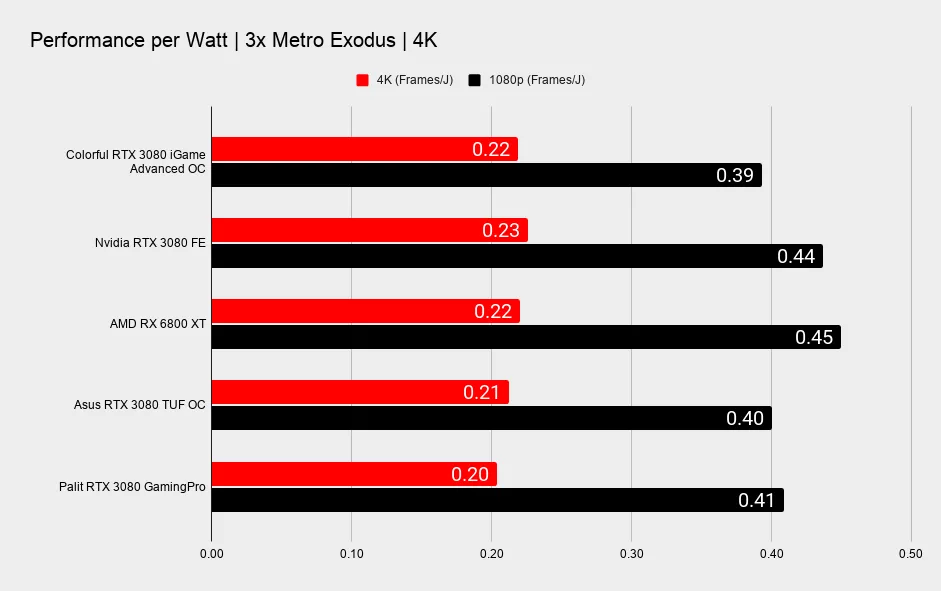 Хотя энергопотребление GeForce RTX 3080 достаточно высоко, эти видеокарты все же предлагают некоторое улучшение энергоэффективности. Конечно, о заявленном почти двукратном улучшении производительности на ватт речь не идет, но этот параметр у новинки лучше, чем у решений на базе Turing.