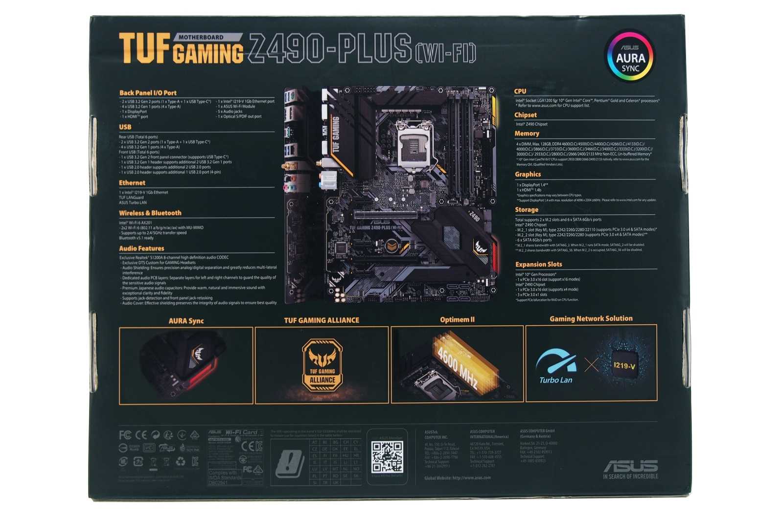 Подробная информация по TUF Gaming Z490-Plus Wi-Fi представлена на тыльной стороне коробки. Здесь присутствуют фотографии материнской платы, разъемов ее тыльной панели, а также текстовая информация в виде отдельных блоков.