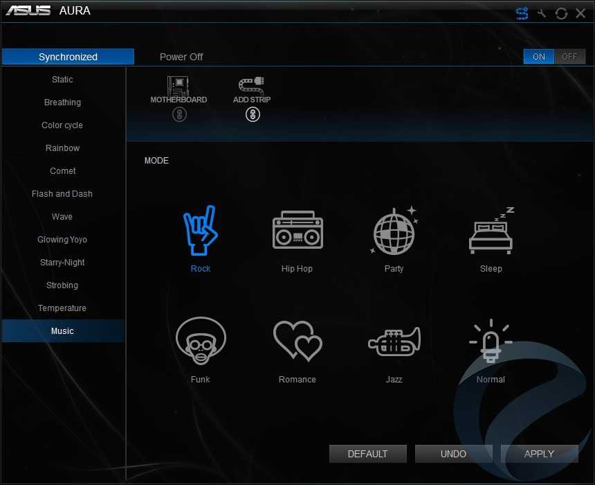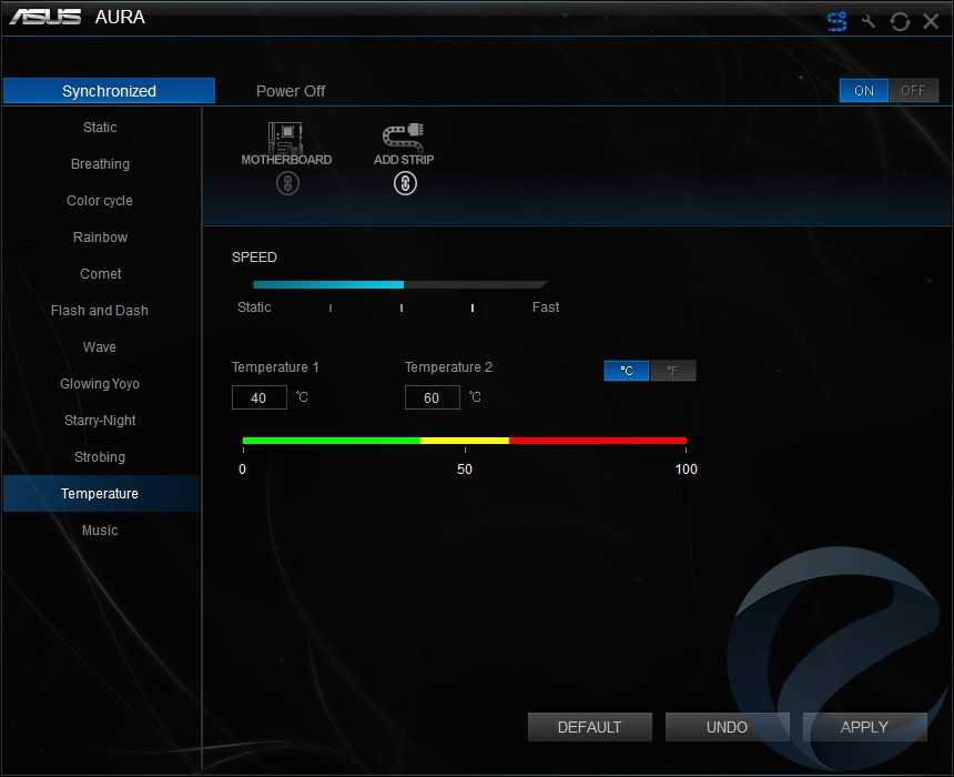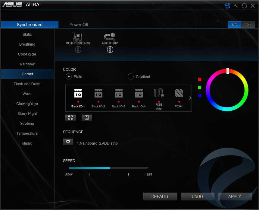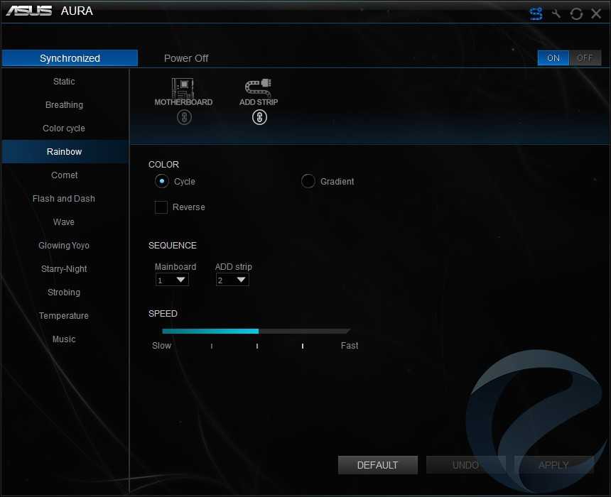 Всего заложено 12 разных эффектов: постоянный цвет (static), дыхание (breathing), цикличная смена цвета (color cycle), радуга (rainbow), комета (comet), пульсация (flash and dash), волна (wave), светящийся йо-йо (glowing yoyo), звездная ночь (starry-night), стробоскоп (strobing), индикатор температуры (temperature), музыка (music). Для них детально настраивается последовательность включения отдельных зон подсветки (sequence), цвет (color) и скорость затухания (speed).