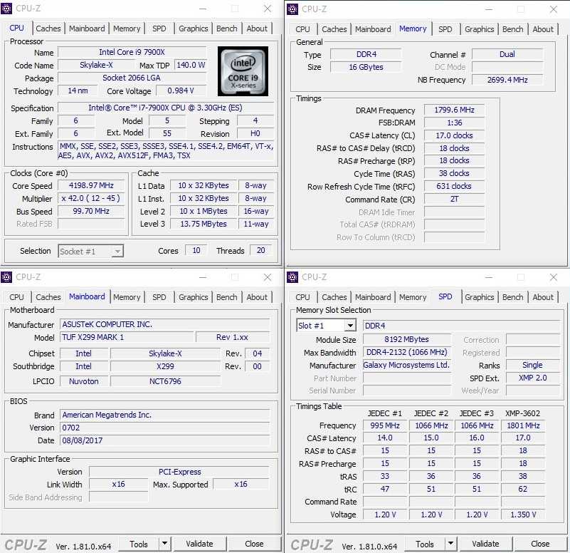 На материнской плате ASUS TUF X299 MARK 1 нам удалось разогнать процессор до частоты 4200 МГц, при этом он сохранял полную стабильность во всех бенчмарках. Для этого нам пришлось повысить напряжение на ядре до 0,98 В.