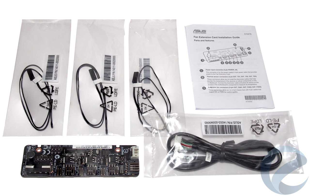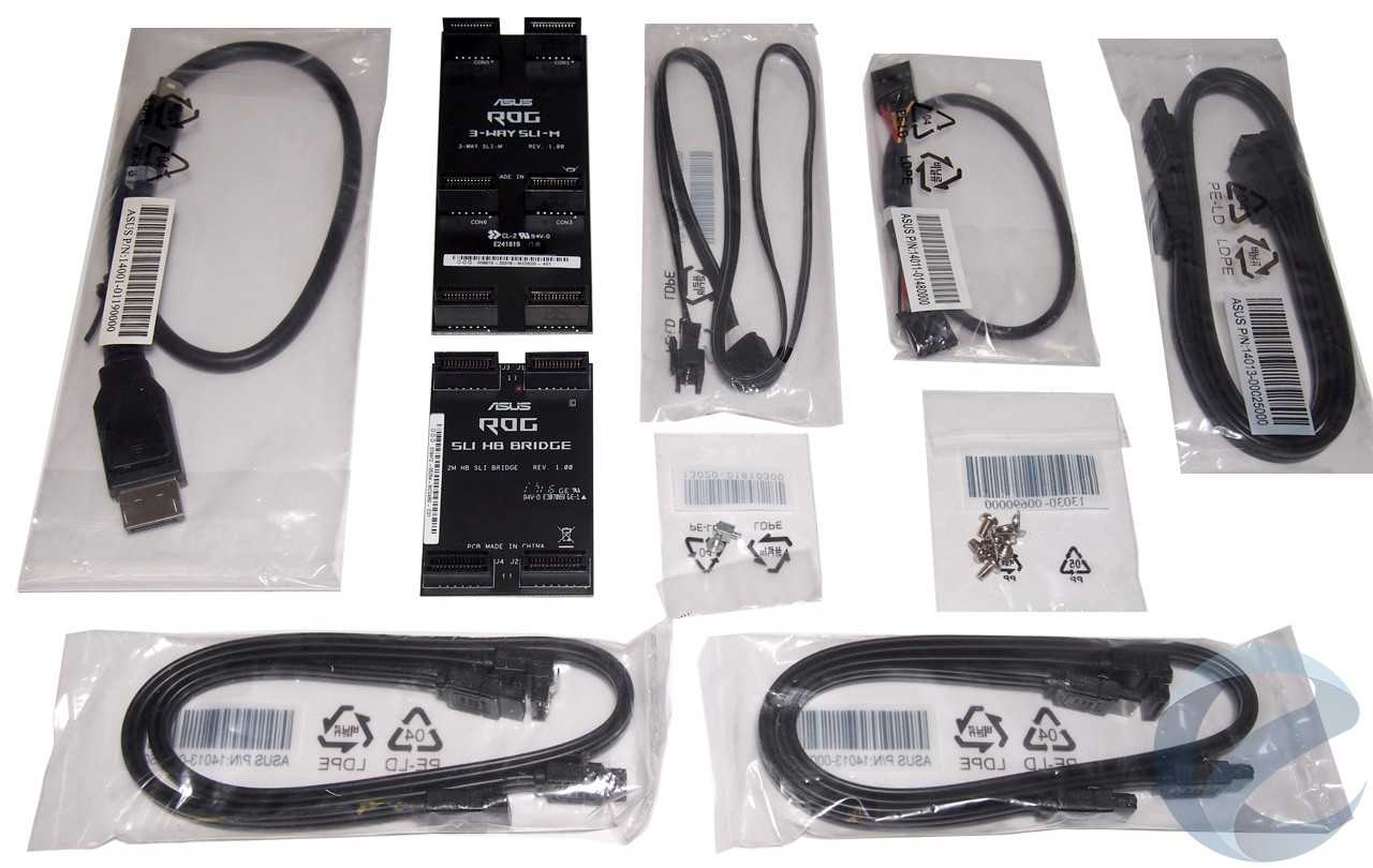 Тем, кому не хватит интегрированных в материнскую плату средств мониторинга и портов подключения вентиляторов, пригодится комплектная плата расширения и три термодатчика. Не забыли вложить и мостки для 3-Way и 2-Way SLI подключений видеокарт, шесть SATA кабелей для носителей информации, DisplayPort-MINI DisplayPort кабель, переходник Q-Connector и кабель для подключения RGB-ленты.
