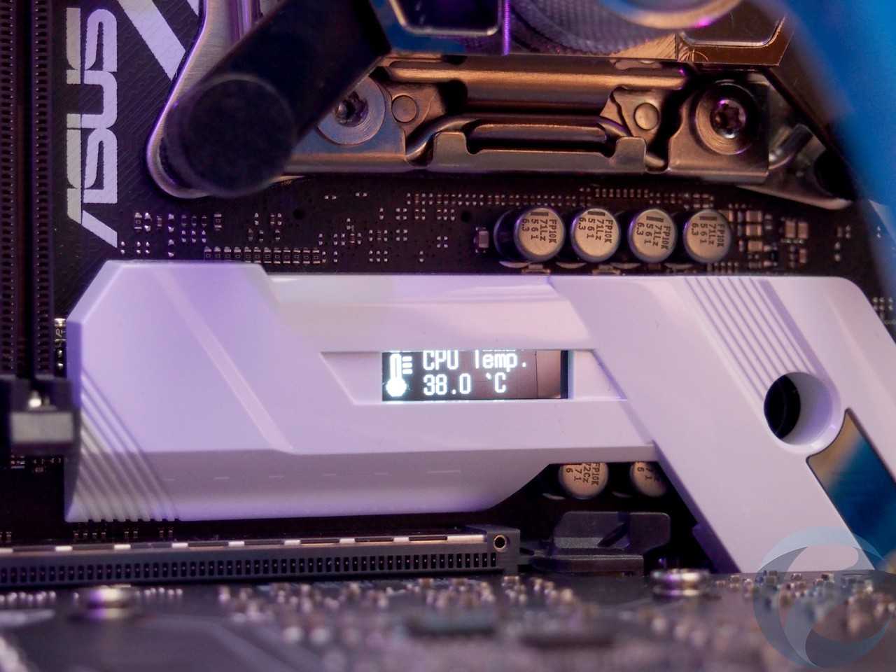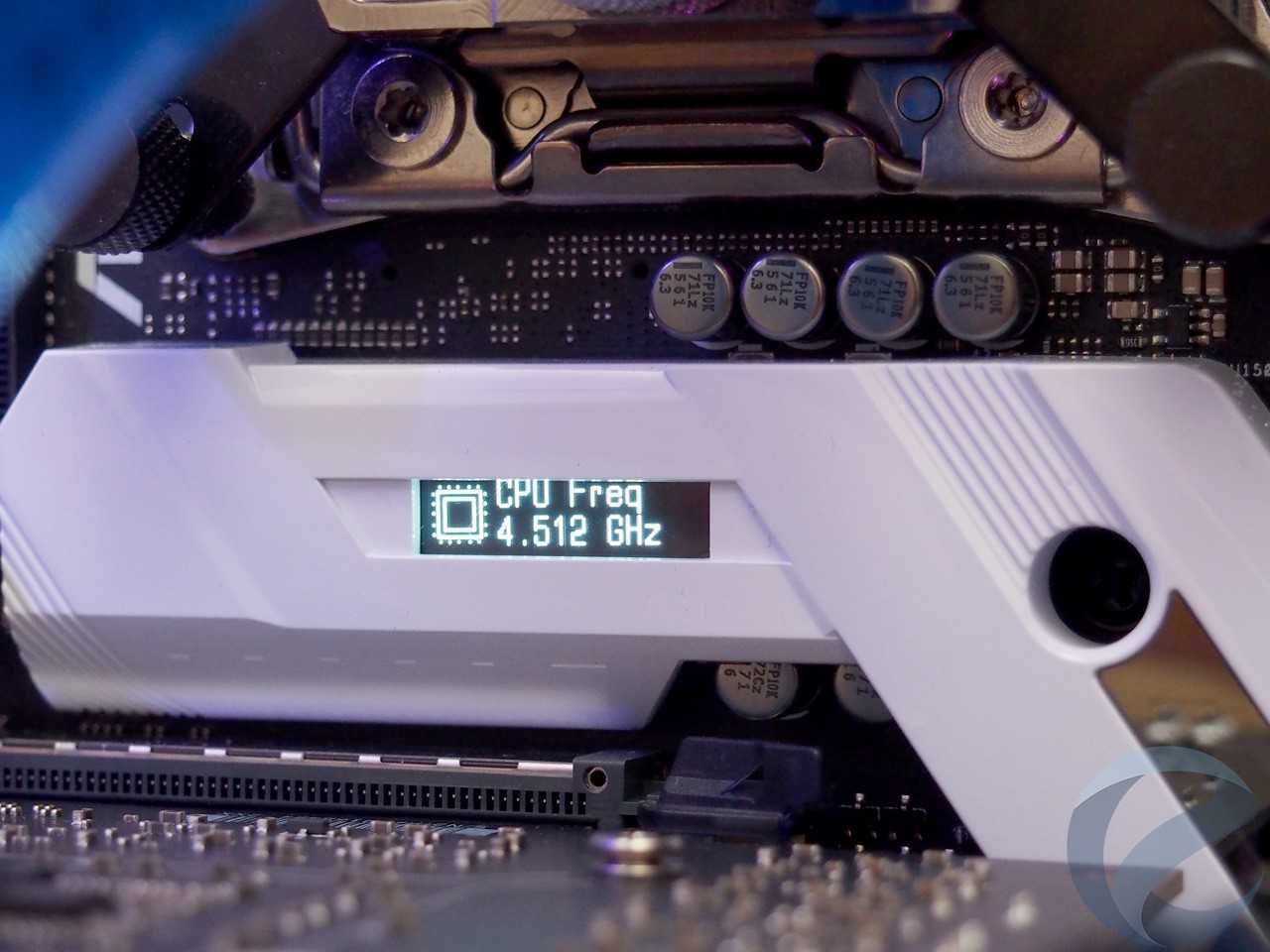 Именно при этих параметрах были пройдены стресс-тесты под нагрузкой, с максимальной температурой ядер процессора 96 градусов Цельсия. Примечательно, что в BIOS есть опция по динамическому отображению степени разгона ПК на заставке с логотипом ASUS при включении ПК, по ее информации был получен условный разгон 13%.