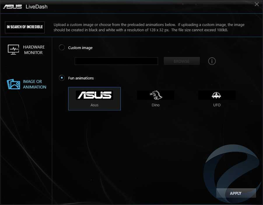 Второй вариант использования — декоративный. Используются черно-белые анимации в формате GIF с разрешением 128 х 32 точки. В программе есть три заготовки: анимированный логотип ASUS и юмористические клипы про инопланетян и динозавра.