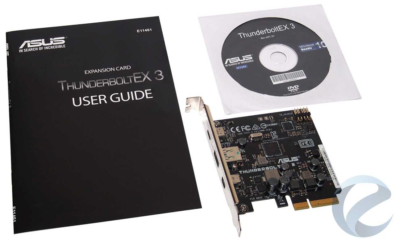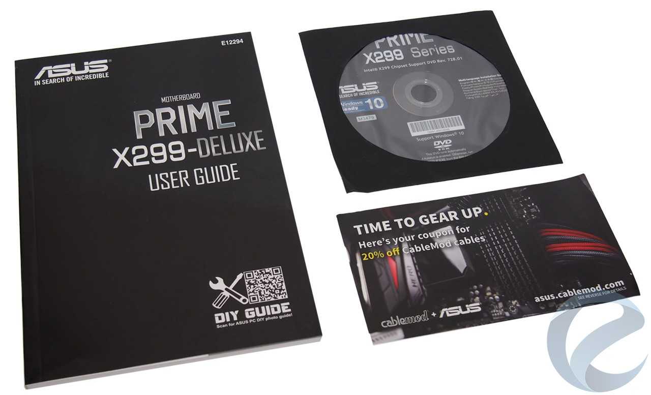 В комплекте с материнской платой ASUS Prime X299-Deluxe идет много аксессуаров и компонентов. В первую очередь, это, конечно же, руководство пользователя и диск с драйверами. ASUS также вложила купон на скидку 20% при покупках в магазине cablemod.com. Для поддержки аппаратного интерфейса Thunderbolt в комплекте идет отдельный PCI-E адаптер и ThunderboltEX 3 GPIO кабель.
