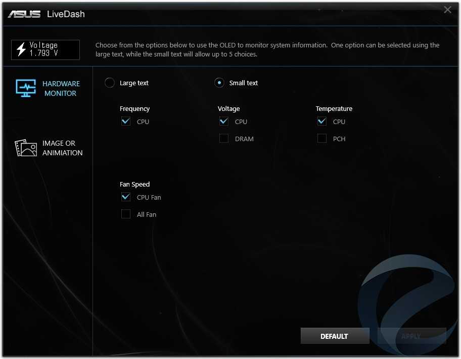С помощью программы LiveDash осуществляется управление OLED-дисплеем на материнской плате. Настроек немного, но интересные режимы есть. В первую очередь, дисплей настраивается на отображение тактовой частоты процессора, напряжения питания, температуру и скорость вентиляторов. Возможно отображение одного из параметров крупным шрифтом (Large text) или до пяти параметров мелким (Small text), с переключением текста раз в 5 секунд.