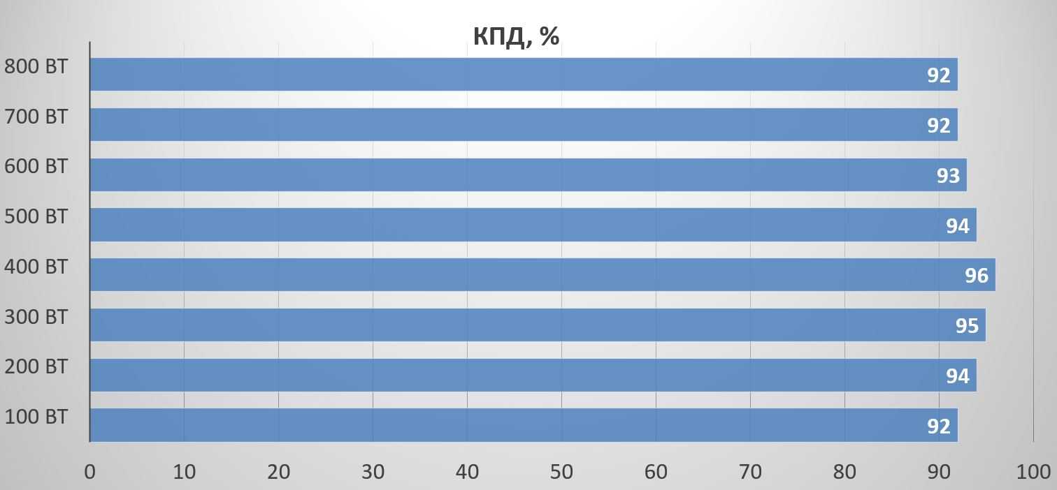 Высокий КПД позволяет блоку разгоняться до предельной производительности и при этом не разогреваться выше температуры 50 °C.