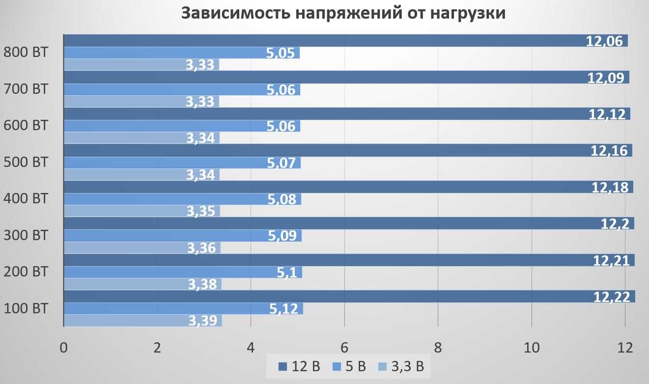 Естественно, кто-то оказался чуть лучше, кто-то – чуть хуже. Так, напряжение 12 В при высокой нагрузке у модели Be quiet! Pure Power 9 CM 700W и Cooler Master MasterWatt Lite 700W опустилось ниже всех, но говорить о недопустимых значениях все равно не приходится.