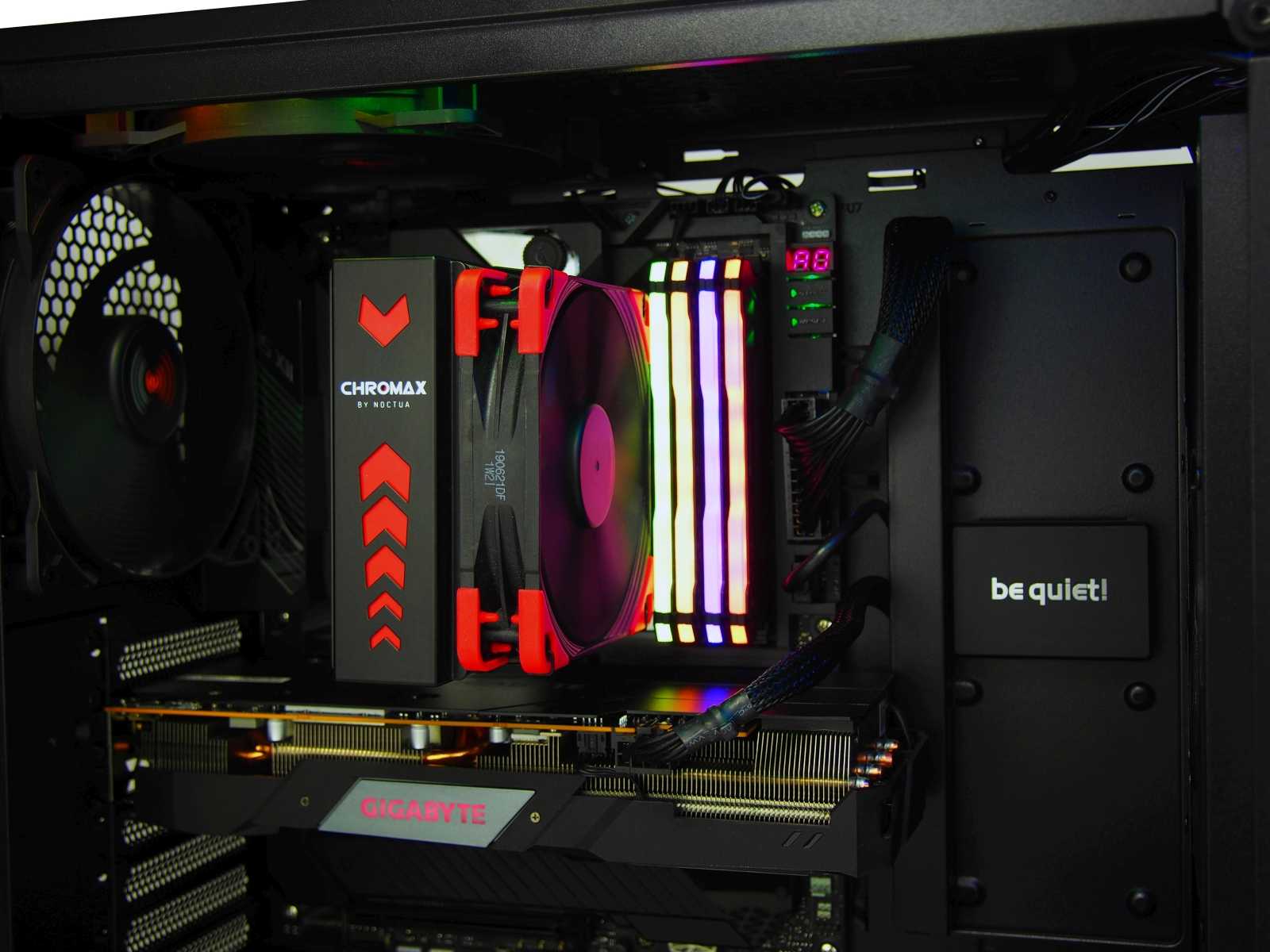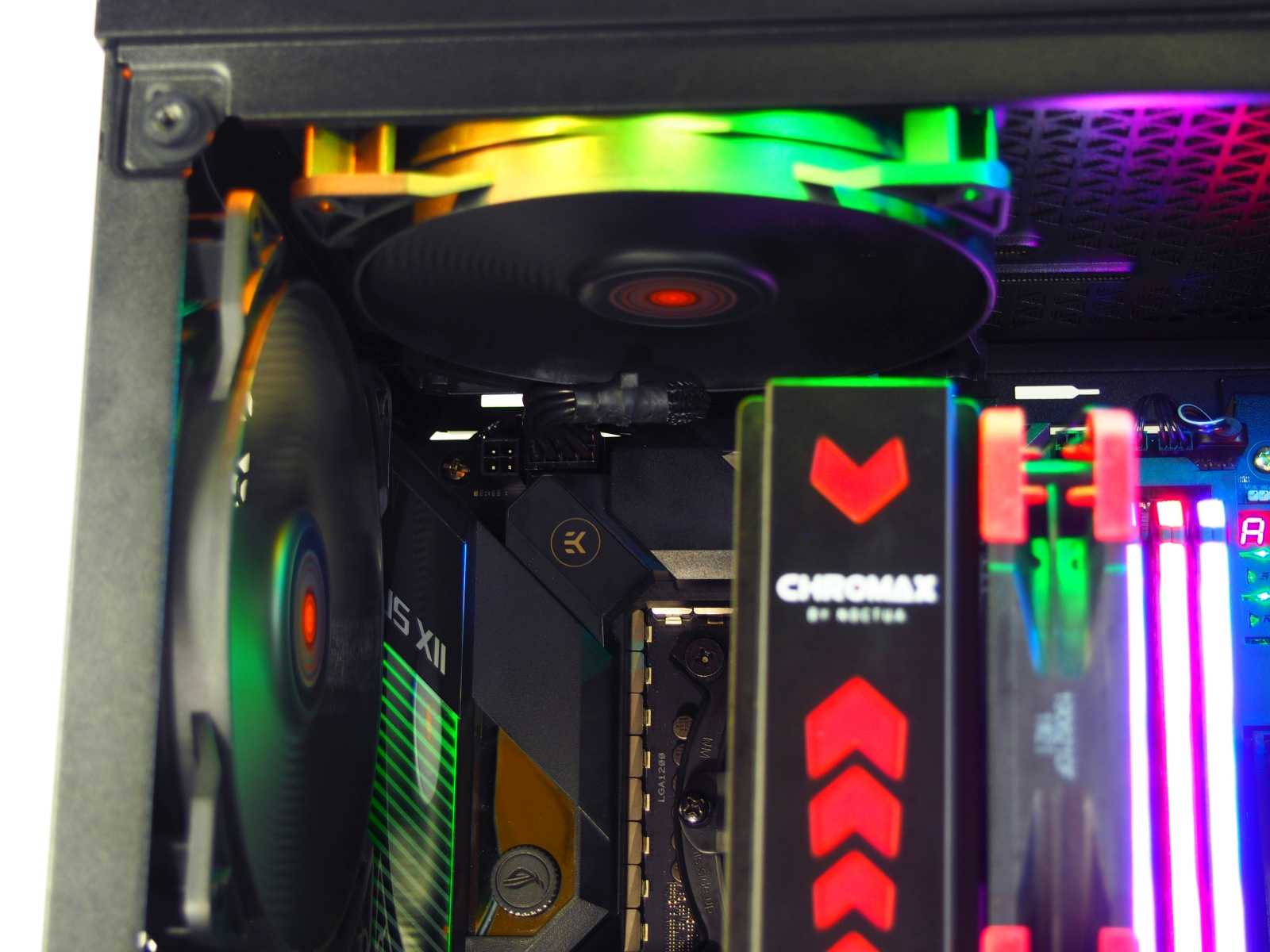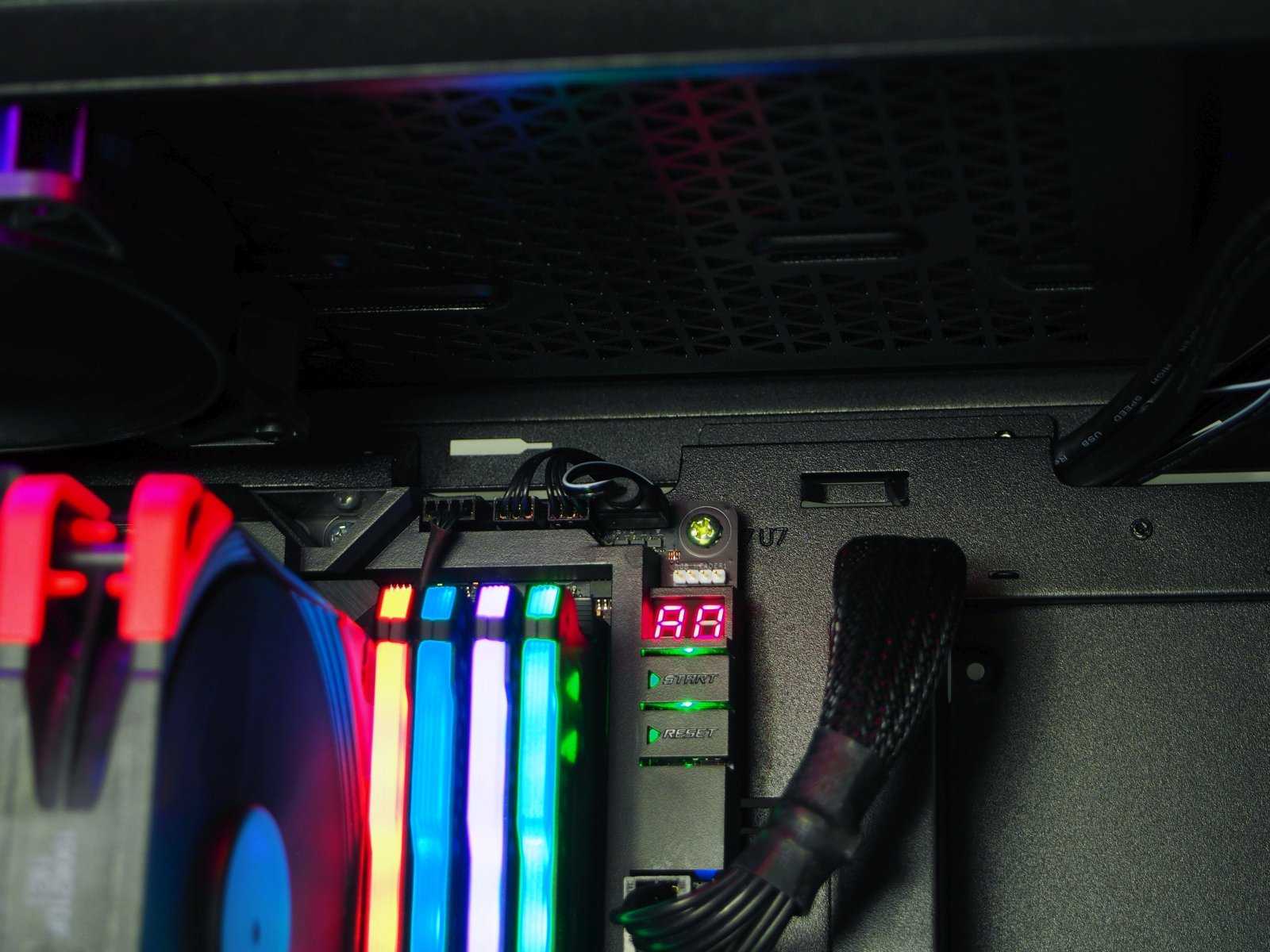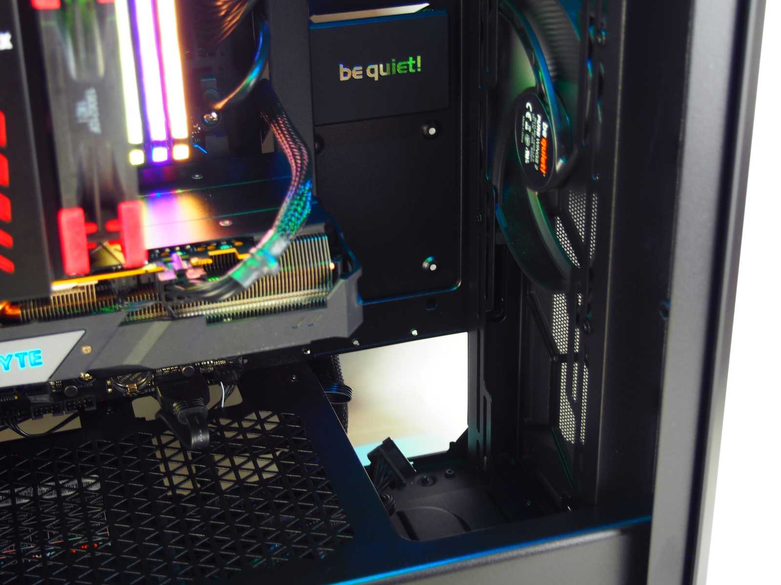 Оценить удобство любого корпуса можно только в процессе сборки. Поэтому в Pure Base 500DX мы собрали игровую сборку в том числе и с использованием комплектующих с RGB-подсветкой. Первое, что стоит отметить в Pure Base 500DX — это удобный кабель-менеджмент. В этом кейсе его можно обыграть достаточно аккуратно и гармонично. Неплохо помогают в этом стяжки из комплекта поставки корпуса.