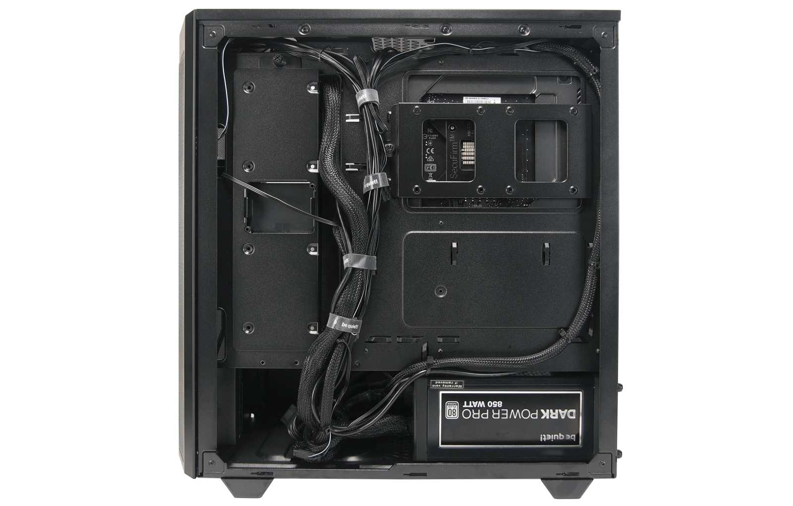 Moving around back, there’s plenty of room for cable management and lots of Velcro straps, which will help keep things tidy during assembly. The backside of the motherboard tray can hold two more 2.5-inch drives.