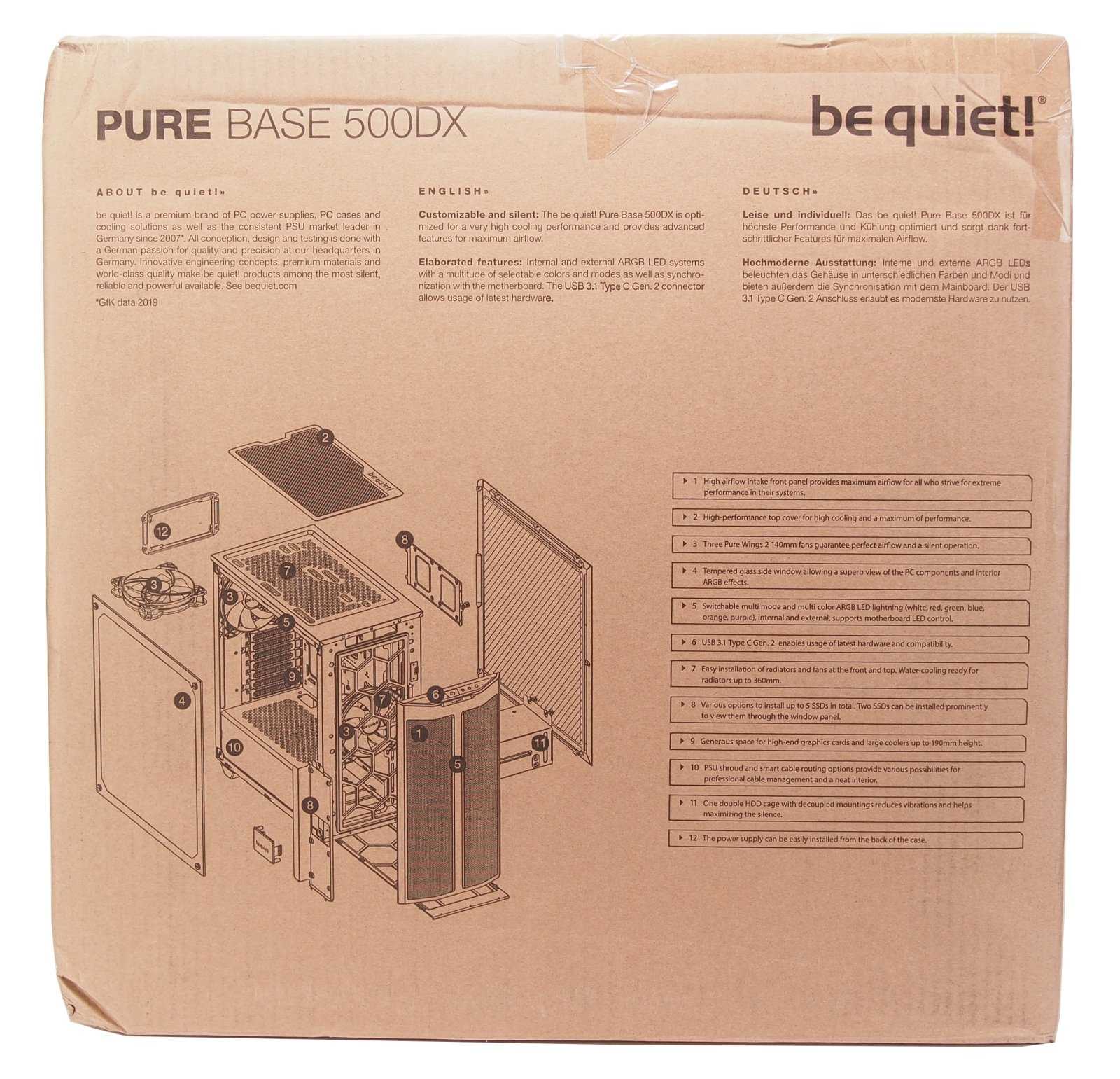 be quiet! Pure Base 500 Window Metallic Gray поставляется в большой картонной коробке, содержащей информацию о компоновке корпуса, совместимости с основными компонентами и его технические характеристики.