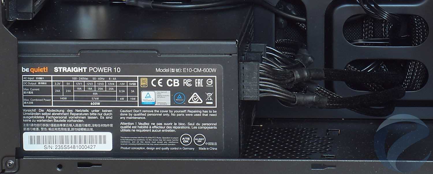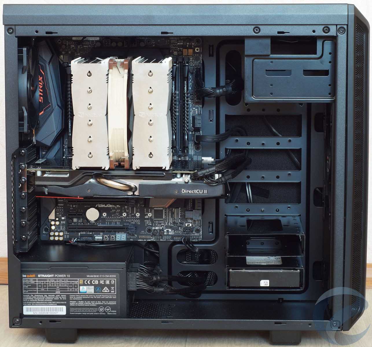 Последовательность сборки особо не регламентируется, но проще начать установку с блока питания (мы использовали модель be quiet! STRAIGHT POWER 10 600W CM). Как видно, места для него хватает и можно задействовать все окна для прокладки кабелей.