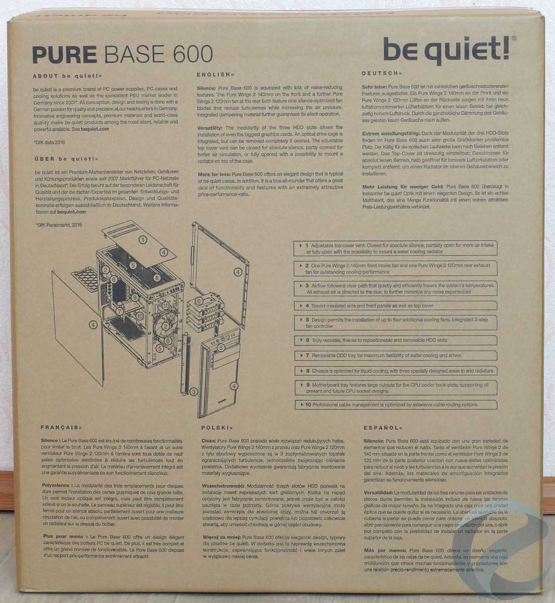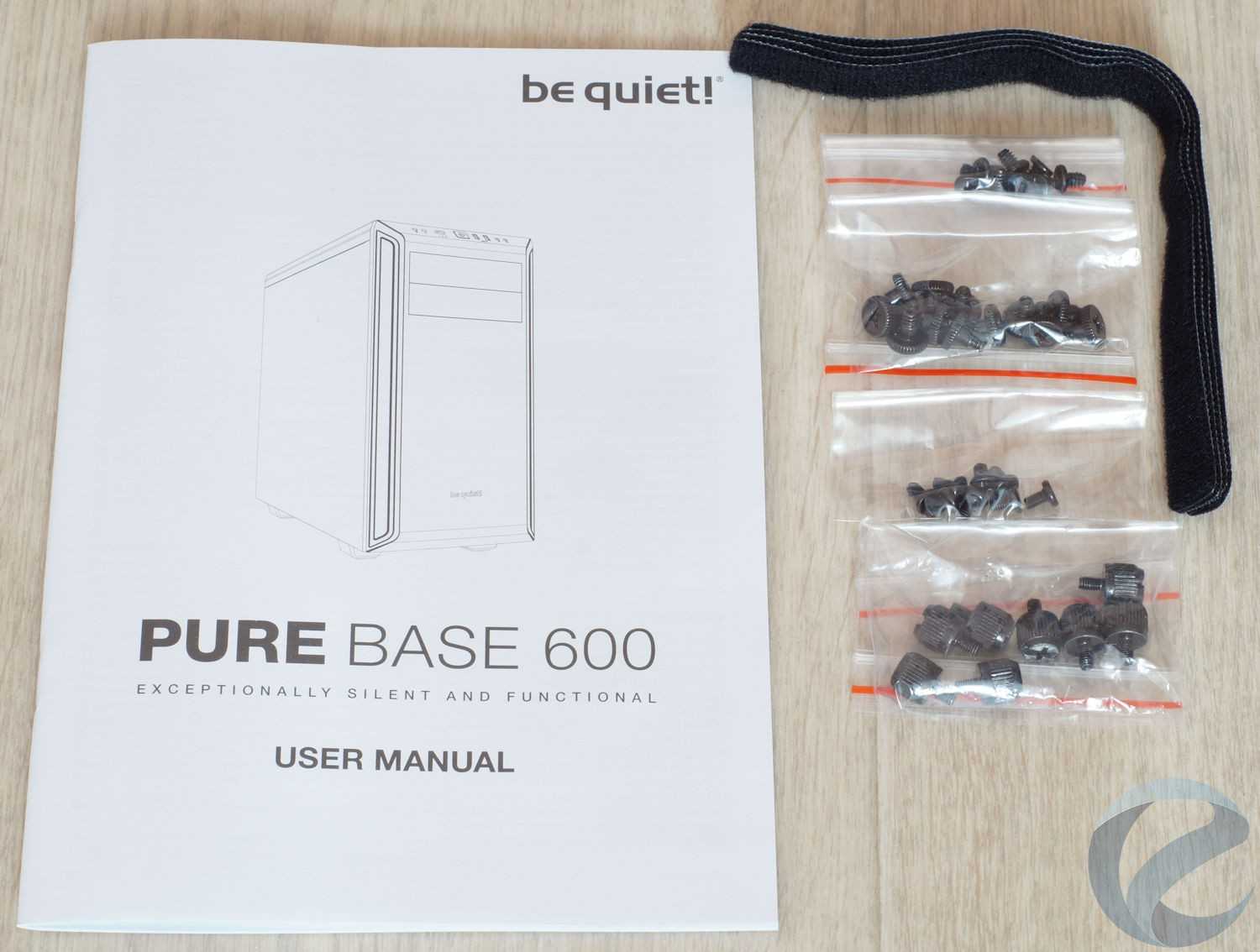 Новый корпус be quiet! Pure Base 600 Black сохранил в себе черты старших моделей и доказал, что он является хорошим выбором при сборки тихого ПК. Из фирменных черт компании отметим использование в нем звукопоглощающих материалов, антивибрационных креплений для накопителей, двух тихих вентиляторов из серии be quiet! Pure Wings 2, которыми, с помощью трехпозиционного реобаса, можно управлять. Онобладает весьма неплохим функционалом, позволяющим установить дополнительные вентиляторы, до двух 360 мм радиаторов (правда в этом случае придется отказаться от установки 5.25″/3.5″ накопителей), видеокарты длиной до 425 мм (с корзинами под накопители только до 280 мм) и кулер высотой до 165 мм.