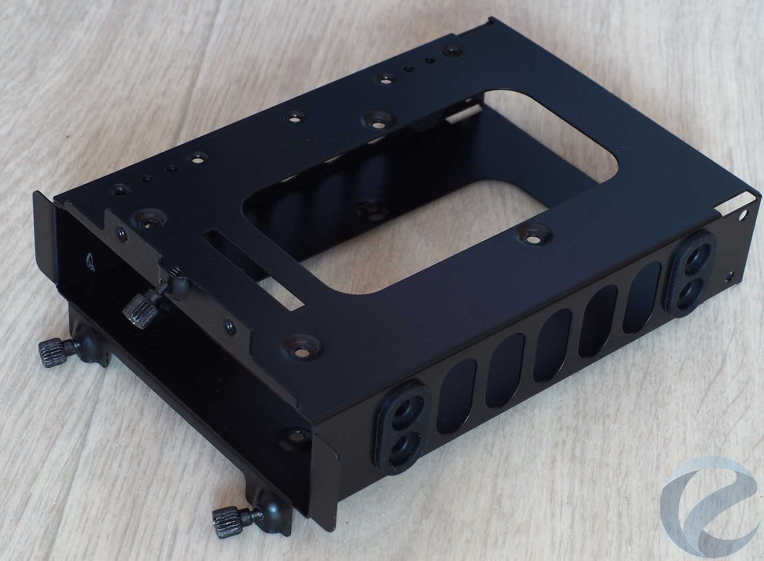 В самих корзинах, вместо 1 х 3.5″ накопителя, можно закрепить 2 х 2.5″ устройства. Все они крепятся с помощью винтов, но для 3.5″ накопителя предусмотрен резиновый демпфер в местах фиксации. Сама корзина фиксируется в корпусе с внешней стороны поддона 3-я винтами.