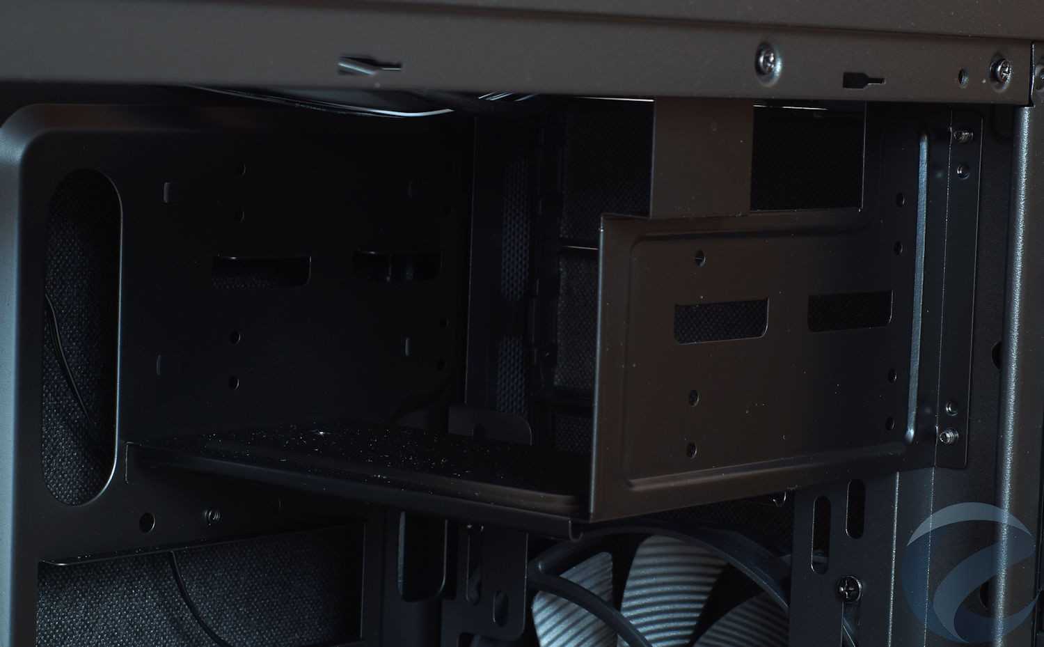Обратная сторона поддона – это место для проводки кабелей и установки 2 х 2.5″ накопителей. Еще одним элементом удешевления конструкции является отсутствие резиновых вставок на отверстиях для кабельменеджмента, поэтому края завальцованы.