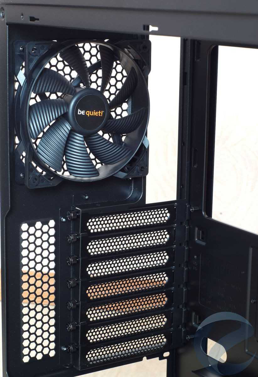 Выше находятся 7 отверстий со съемными заглушками под установку плат расширения, что вполне типично для подавляющего большинства MidTower корпусов и на стенке можно увидеть фирменный 120 мм вентилятор be quiet! Pure Wings 2.