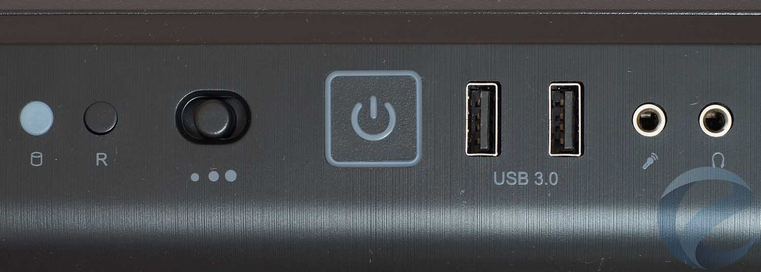 Трапециевидный скос вверху передней части корпуса — место для кнопки включения и сброса, индикатора активности жёстких дисков, двух портов USB 3.0, а также разъёмов для микрофона и наушников.