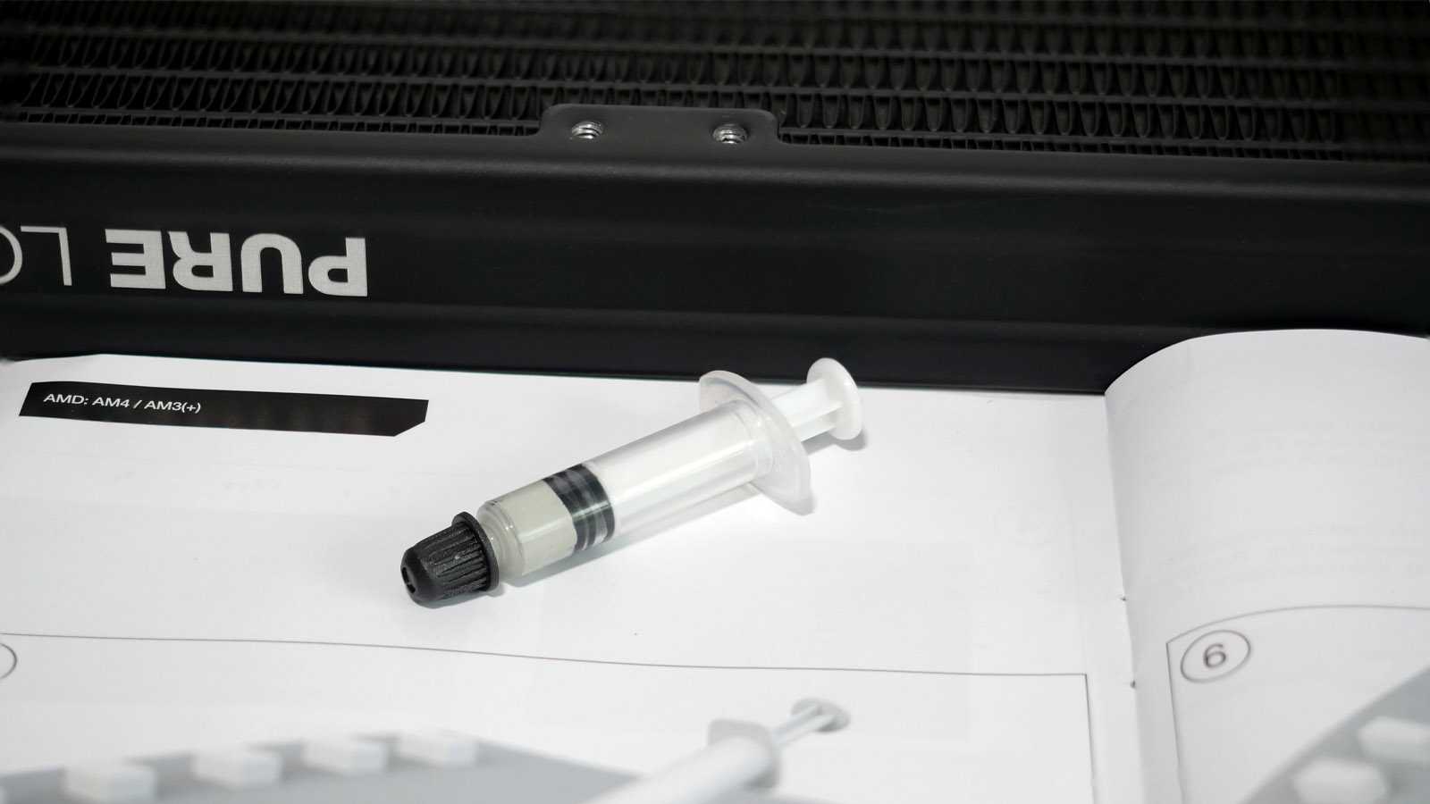К be quiet! Pure Loop 360 прилагается небольшой шприц без маркировки с запасом термопасты около 1 грамма. Этого должно хватить на пару установок. Термопаста имеет серый цвет и консистенцию, напоминающую таковую у ARCTIC MX-2. Разравнивается легко. Содержимого достаточно для нескольких установок.