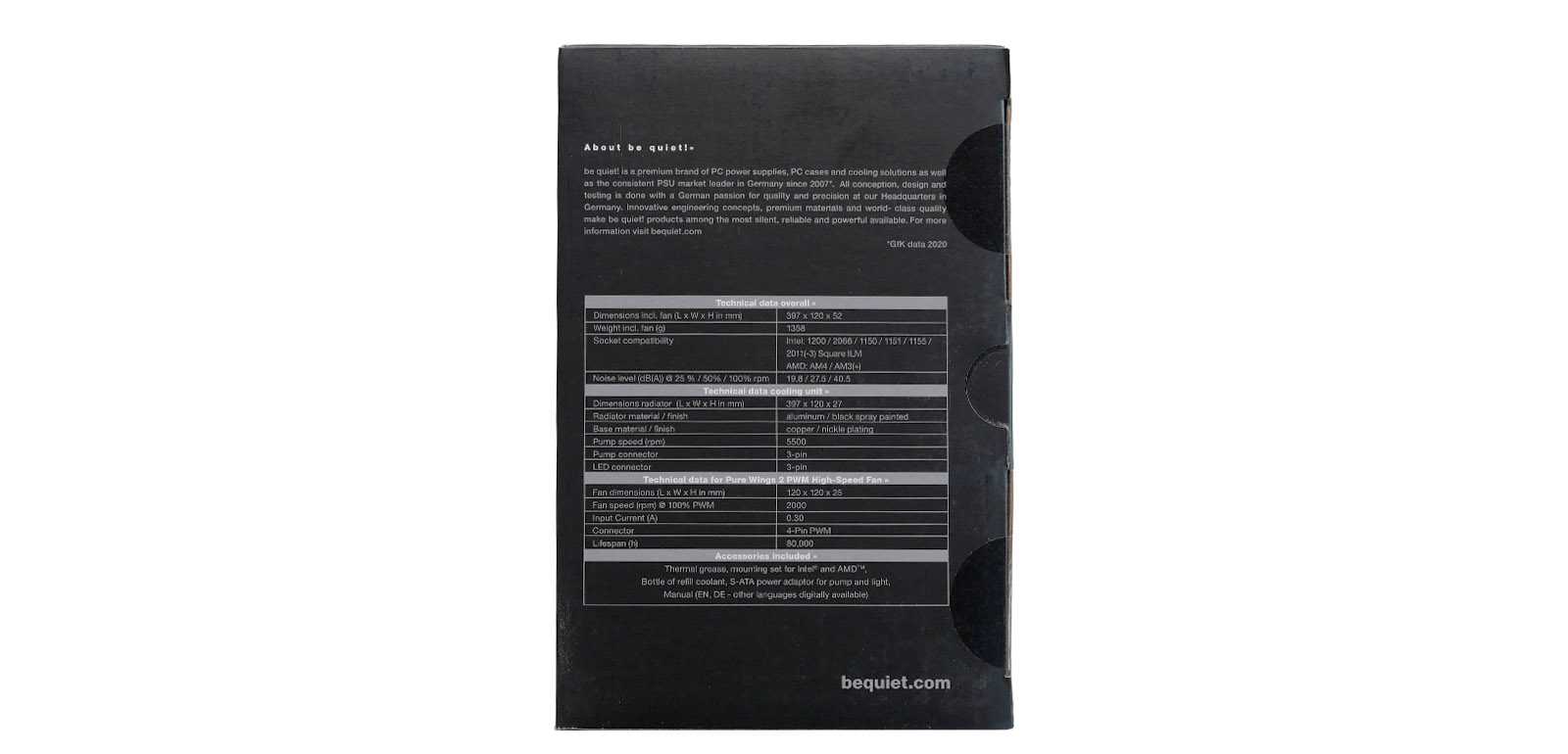 Система охлаждения продаётся в картонной коробке размером 460 х 206 х 138 мм. Она оформлена в привычных для продукции be quiet! тёмных тонах и украшена фотореалистичным изображением устройства.