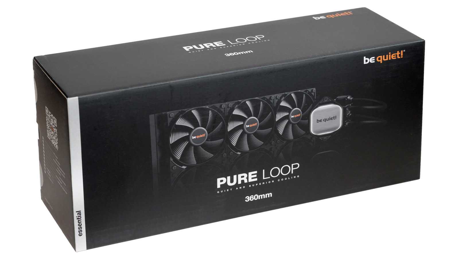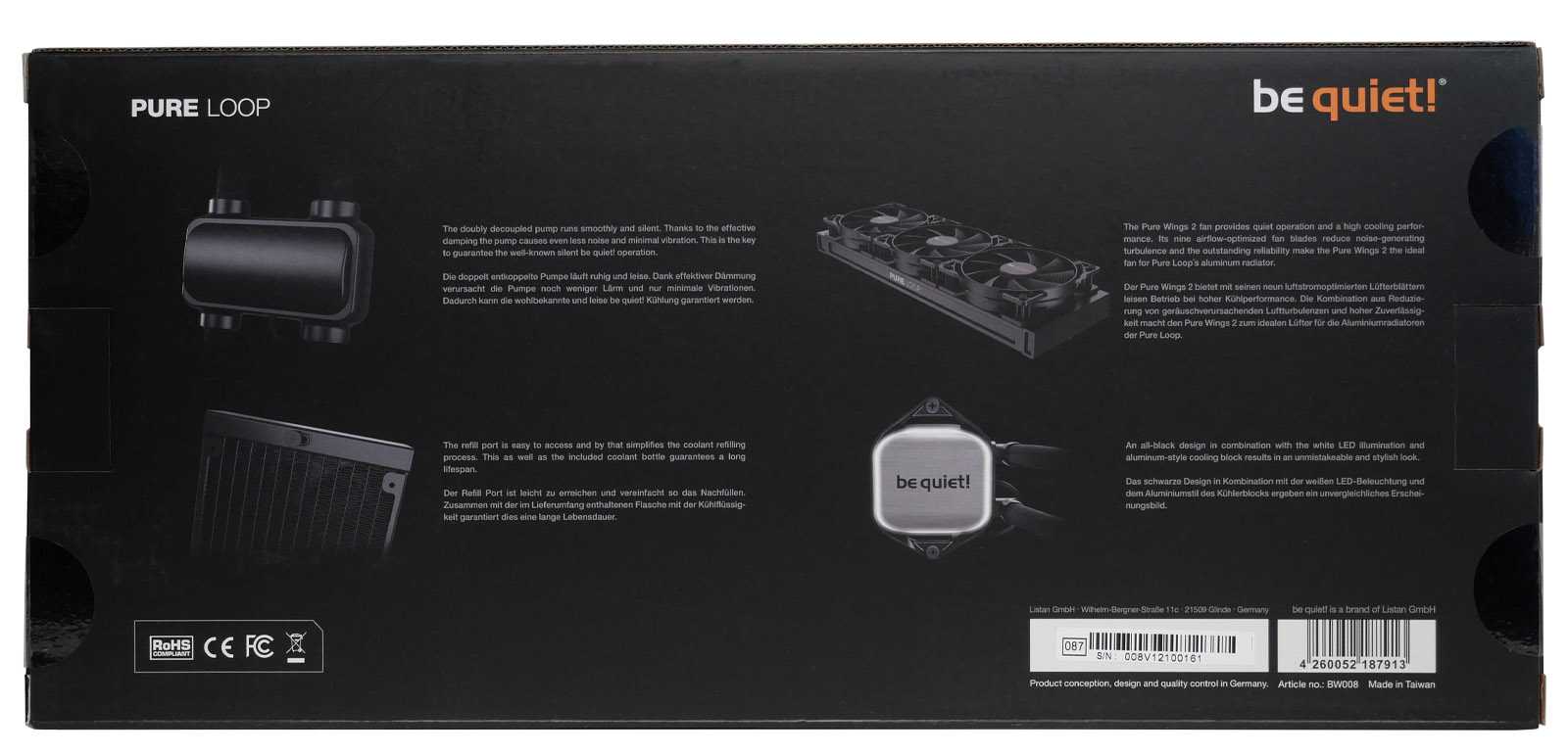 Кулер Pure Loop поставляется в прочной картонной коробке, которая вместе с нестандартными внутренними вставками обеспечивает отличную защиту при транспортировке. Он эстетически темный и тусклый, как почти все коробки продуктов Be Quiet!, Но с большим количеством информации о кулере, который можно найти по бокам и сзади коробки.