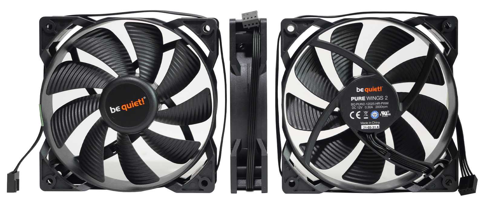 Для активного охлаждения радиатора используются три вентилятора Pure Wings 2 размера 120 x 120 x 25 мм. Их особенностью является особая рельефная форма лопастей для снижения турбулентности и малошумности воздушного потока.