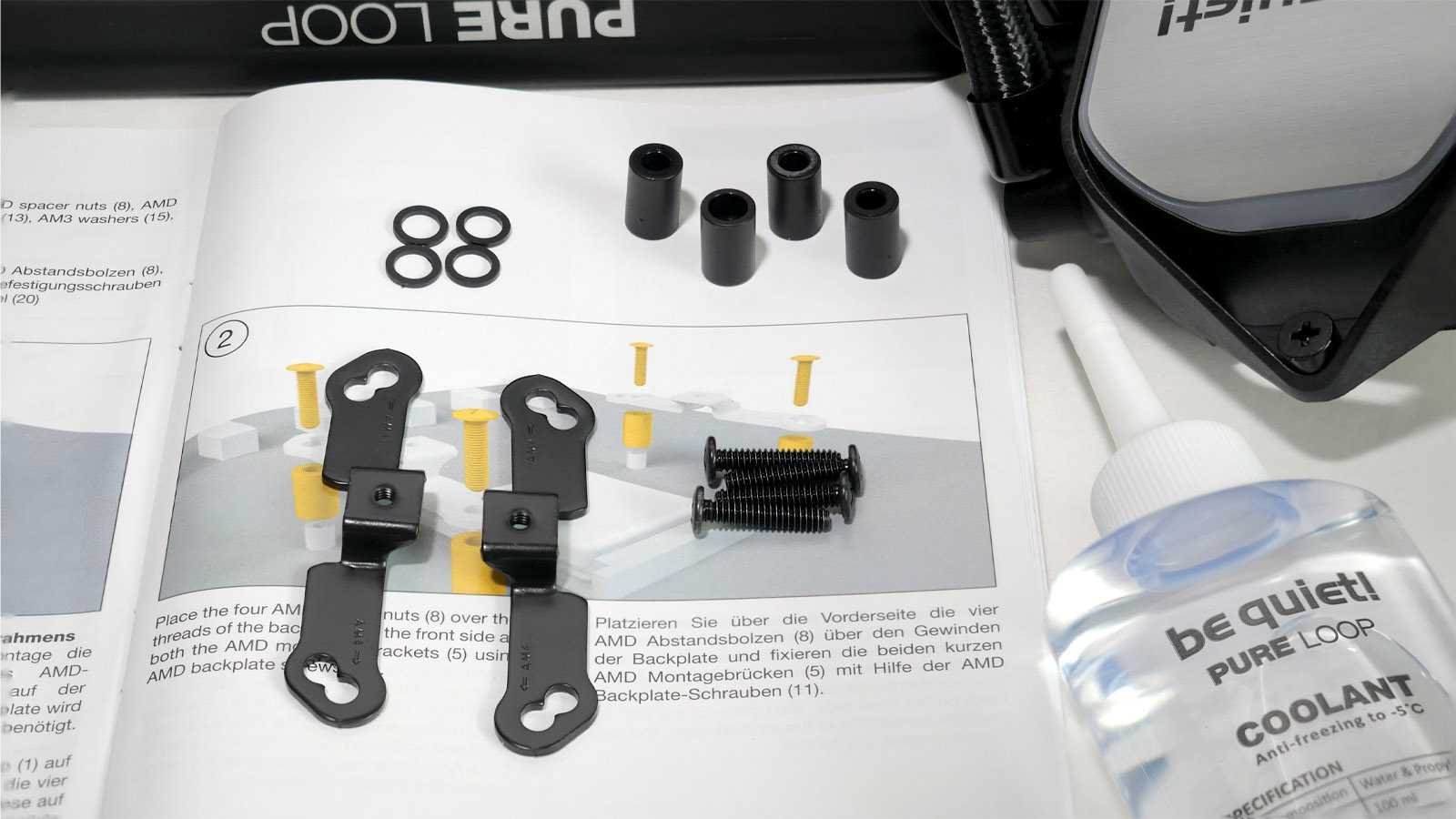 По комплектации be quiet! — моё «увожение», водяночка спокойно конкурентов обошла, поскольку имеет в коробочке не только привычный суповой набор, то есть, вертушки, крепления на Intel/AMD, кабель-тройник под ШИМ, кучу инструкций.
