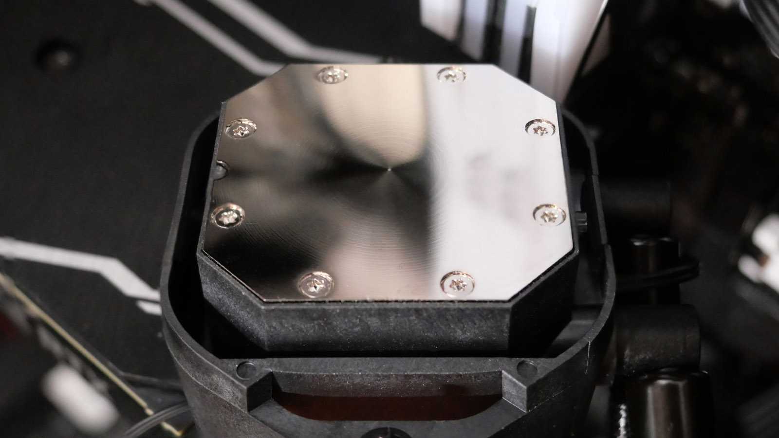 Поверхность пластины в основании водоблока отполирована до полуглянцевого состояния. Центральная часть имеет технологическую выпуклость в доли миллиметра для акцентирования прижатия к теплораспределительной крышке процессора.