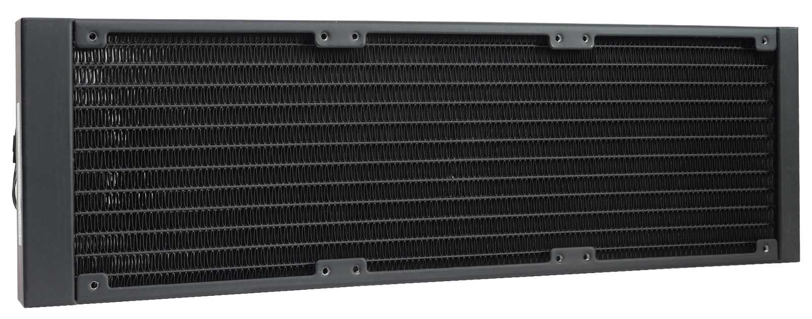 Радиатор сделан из алюминия, окрашенного в чёрный цвет. Производитель в документации упоминает о допустимости локальных непрокрасов в труднодоступных местах, что не влияет на качество охлаждения. Но таковые на протестированном экземпляре замечены не были. Всё окрашено очень качественно. Рабочее тело набрано двенадцатью каналами с заполнением пространства между ними алюминиевой гофрированной лентой. Длина каркаса с учетом служебных областей для закольцовки каналов составляет 397 мм.