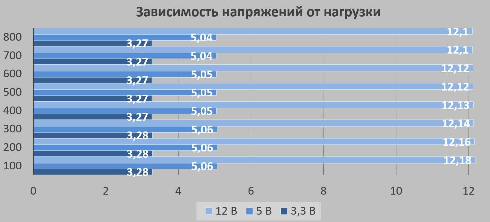 Линия +3,3 В понижена менее одного процента и под нагрузкой остается в практически неизменных значениях.