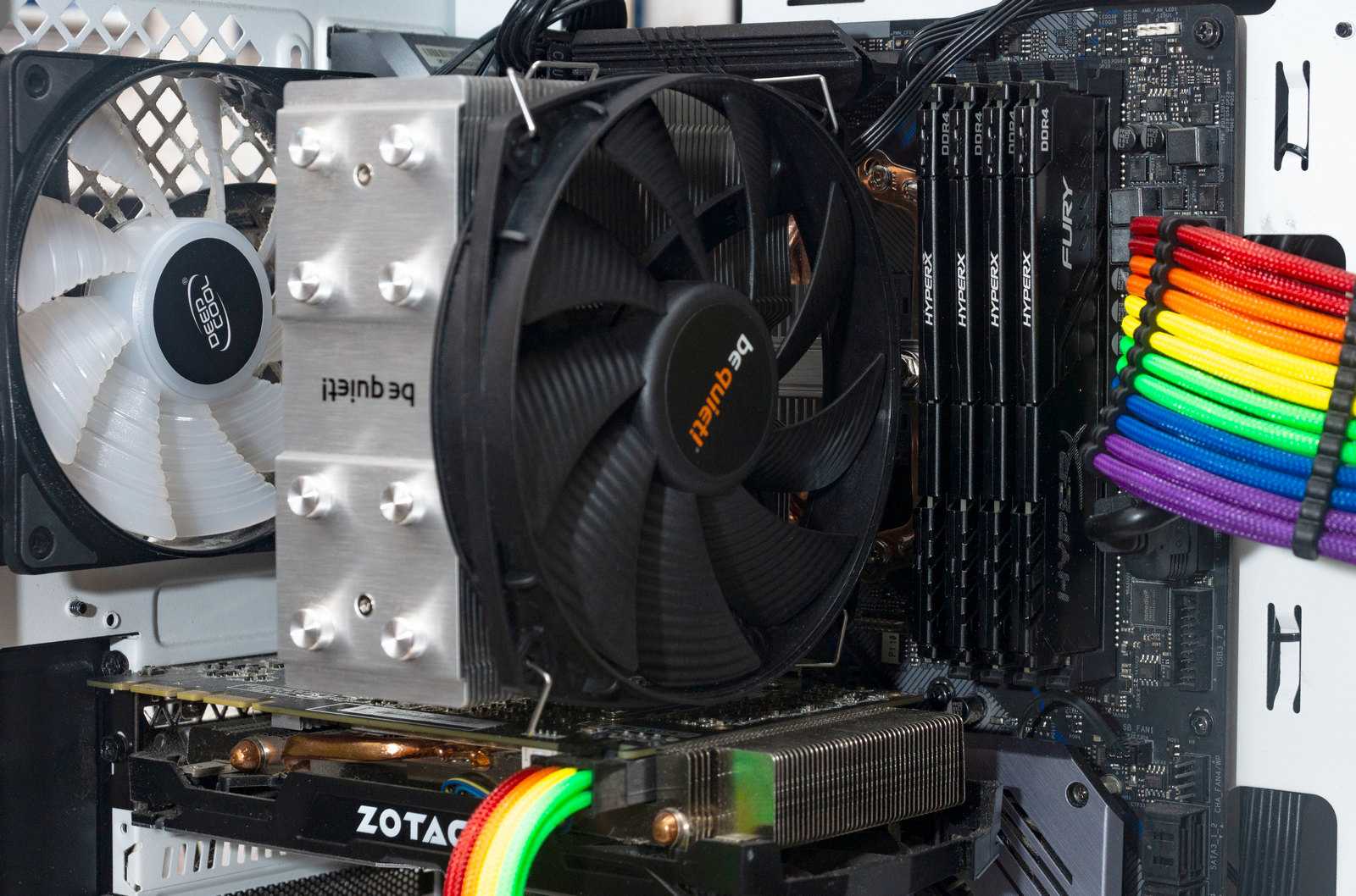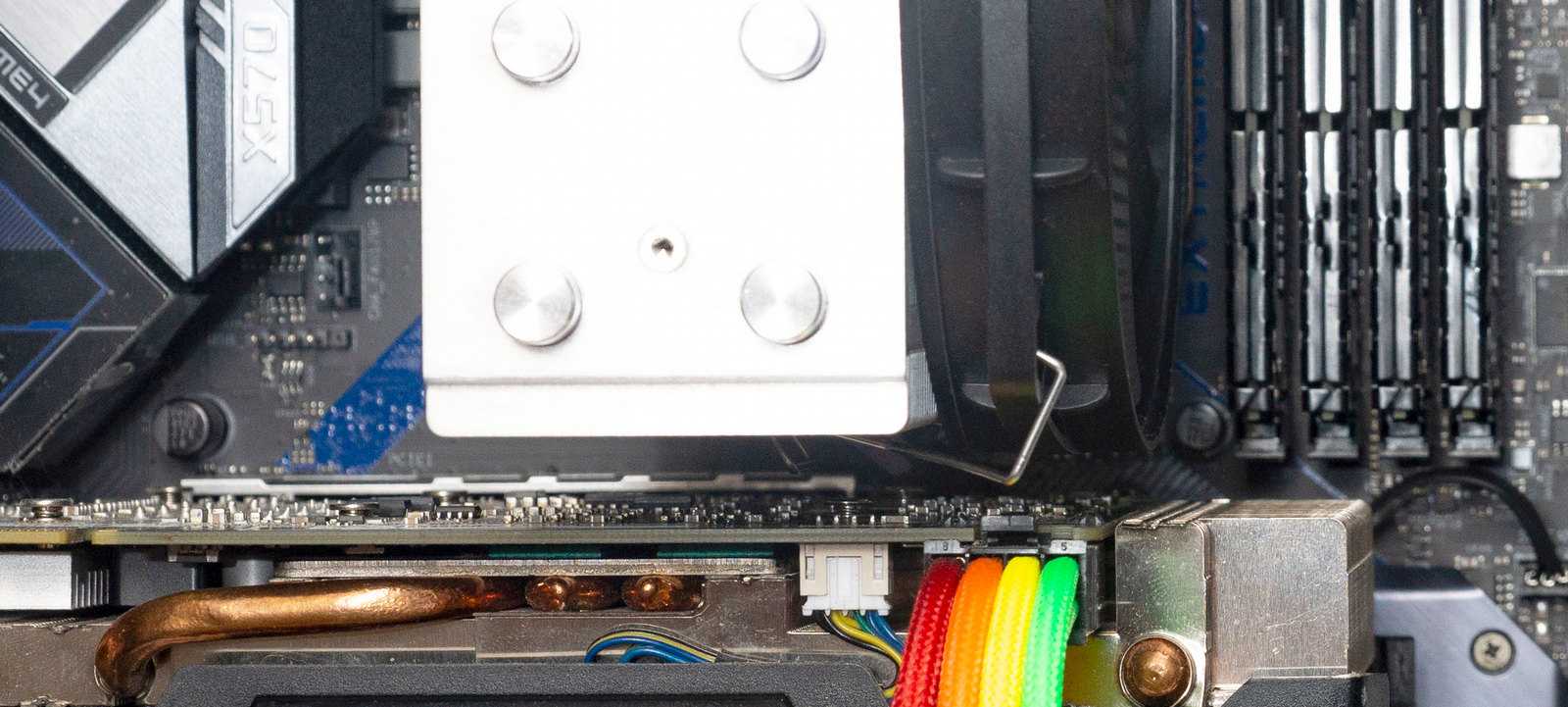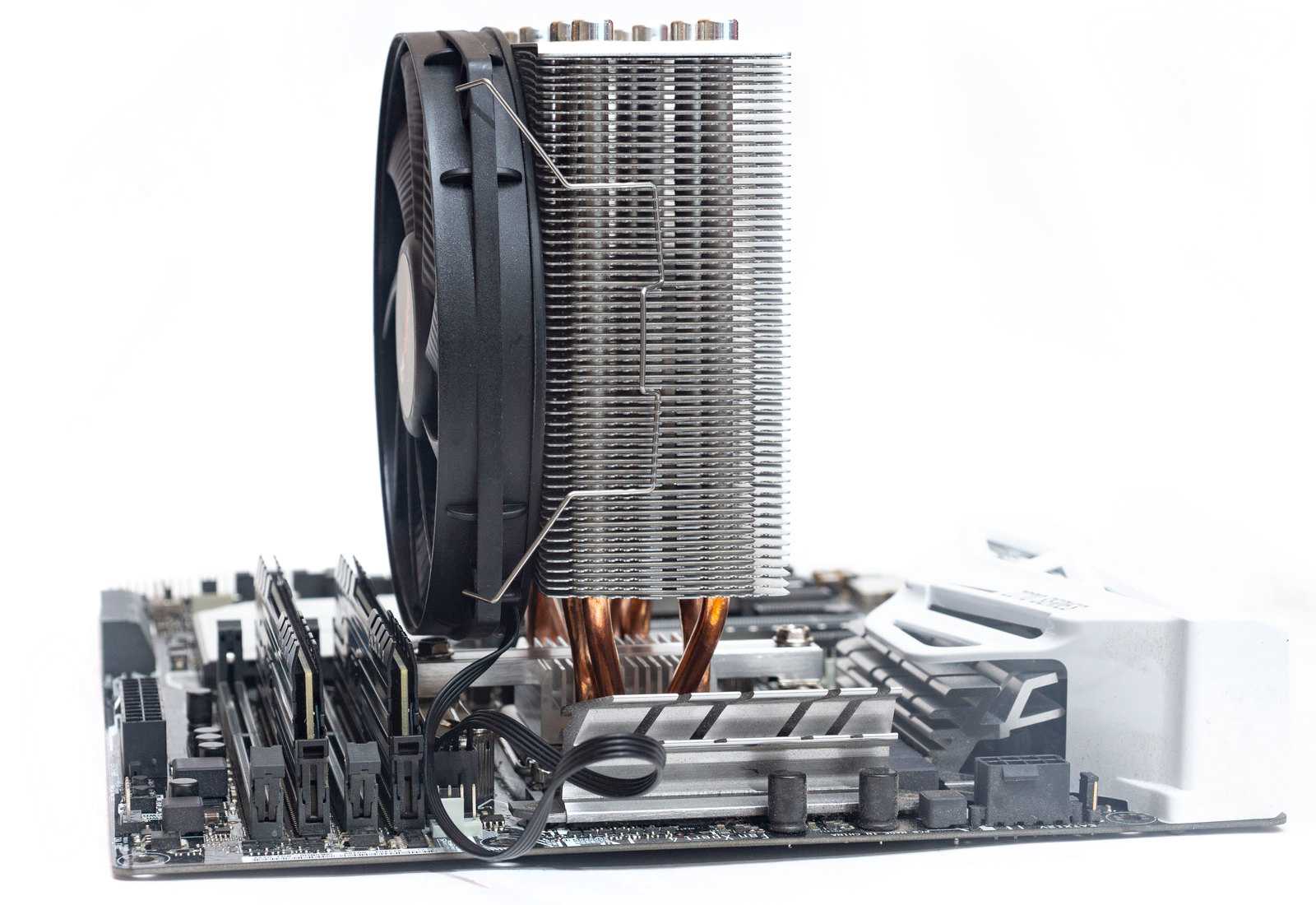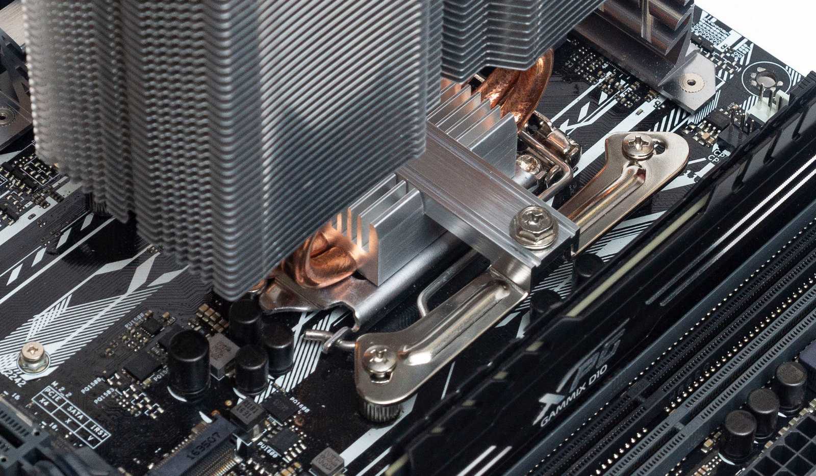Вентилятор, установленный на радиатор, не перекрывает слоты оперативной памяти, что позволит устанавливать планки памяти с габаритными радиаторами.