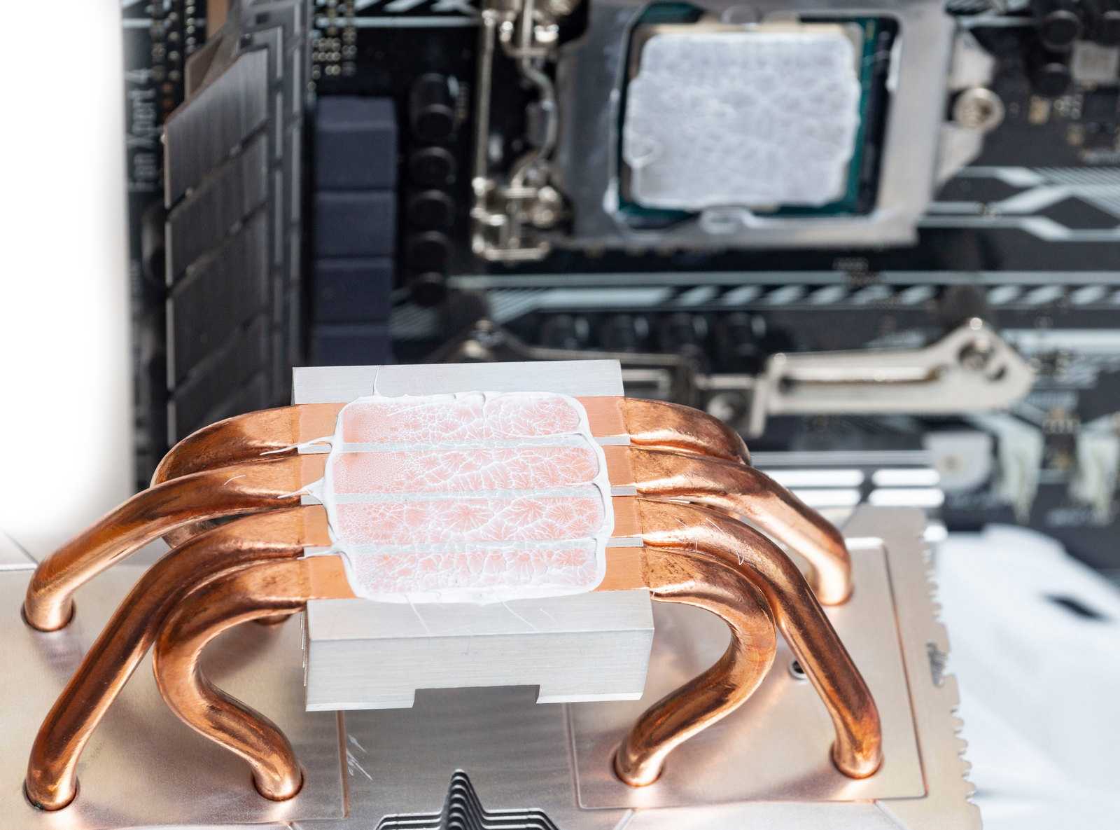 Отпечаток равномерный, что говорит о ровной поверхности основания кулера. Выраженных следов от трубок на крышке процессора незаметно.