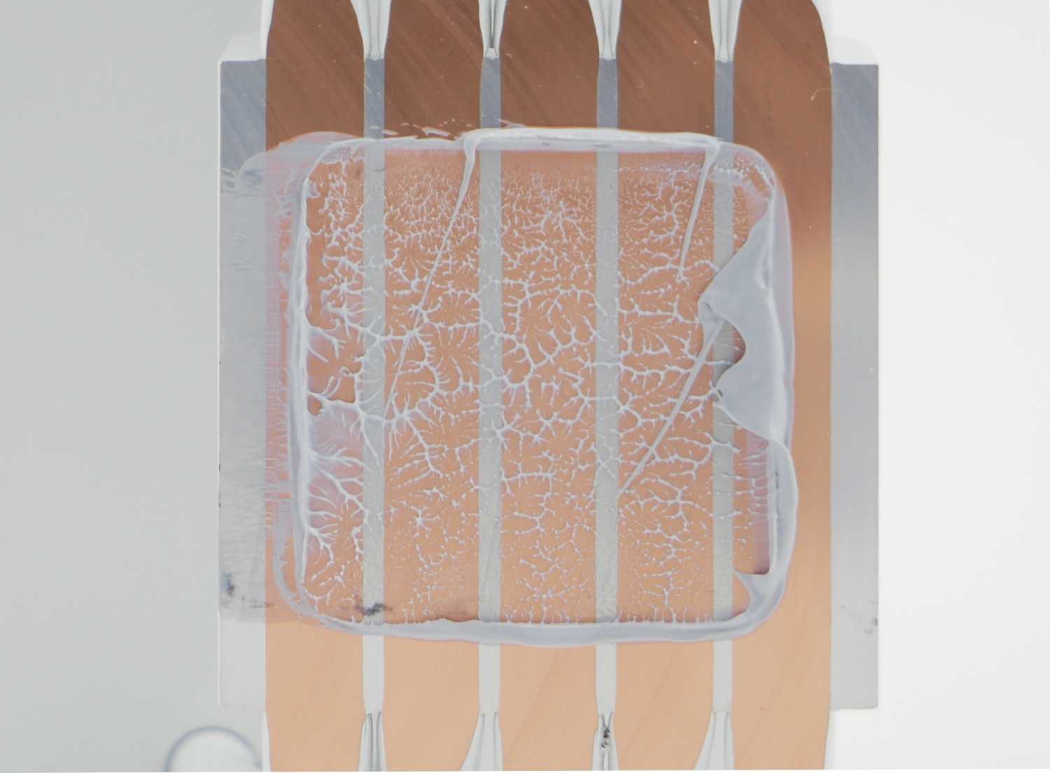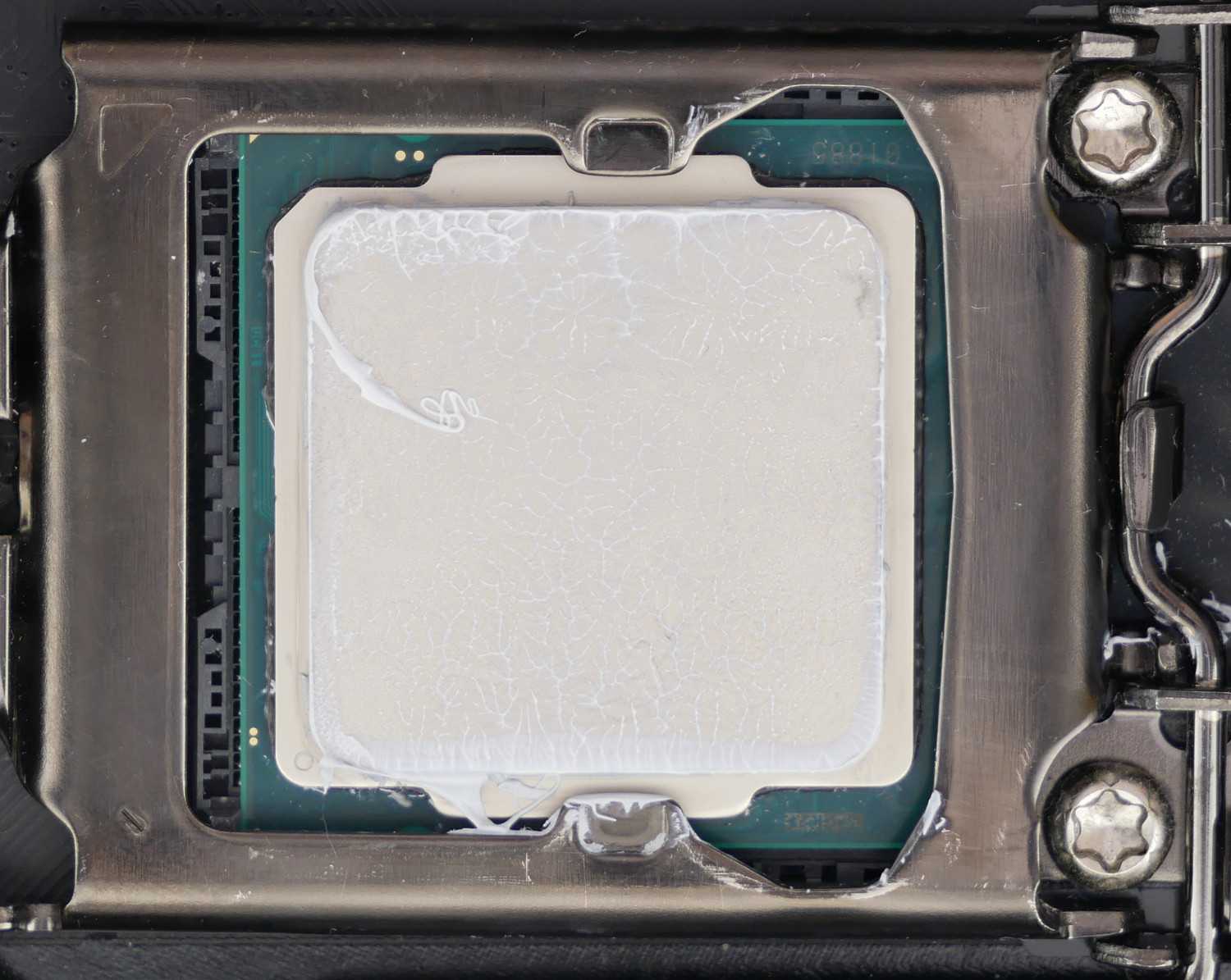 Отпечаток термоинтерфейса показывает отличную прижимную силу и равномерное распределение пасты: лишь капельку в нижнем левом углу заметна ложбинка. Таким эффектом не могут похвастаться куда более дорогие аналоги!