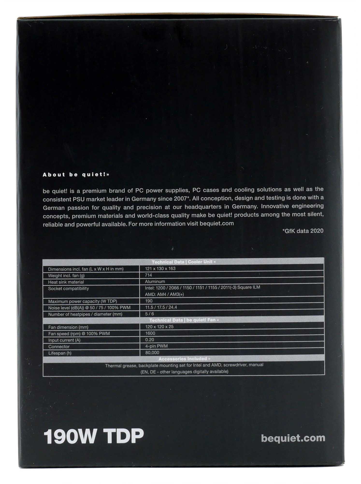 Внешне оформление очень сдержано, как и информативная составляющая. Описание производителя демонстрируется с таблицей технических характеристик, а огромная цифра TDP 190W дает нелегкие намеки об эффективности нашего героя. Сзади расположились достоинства продукта: совместимость с актуальными платформами, высокими модулями памяти и технология HDT с прямым контактом основания.